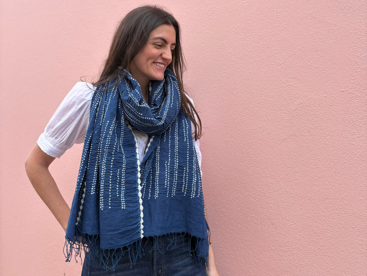 Suzusan are masters of the traditional shibori technique. They regard shibori as a cultural heritage. Pieces made through intricate handwork including textiles being tied, sewn or folded before dyeing. Through this manipulation, wonderful flowing colour gradients and contrasts, and even three-dimensional patterns and structures are made.