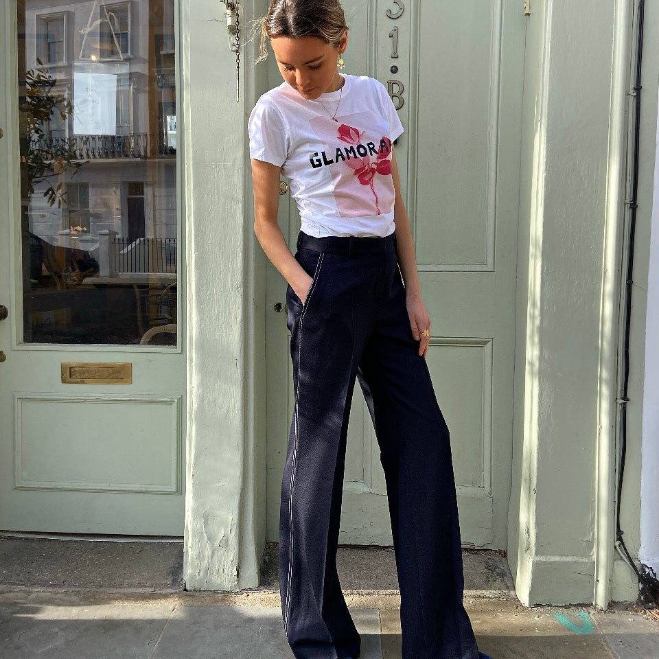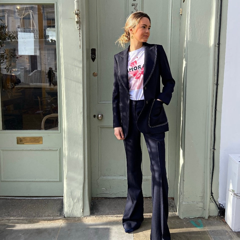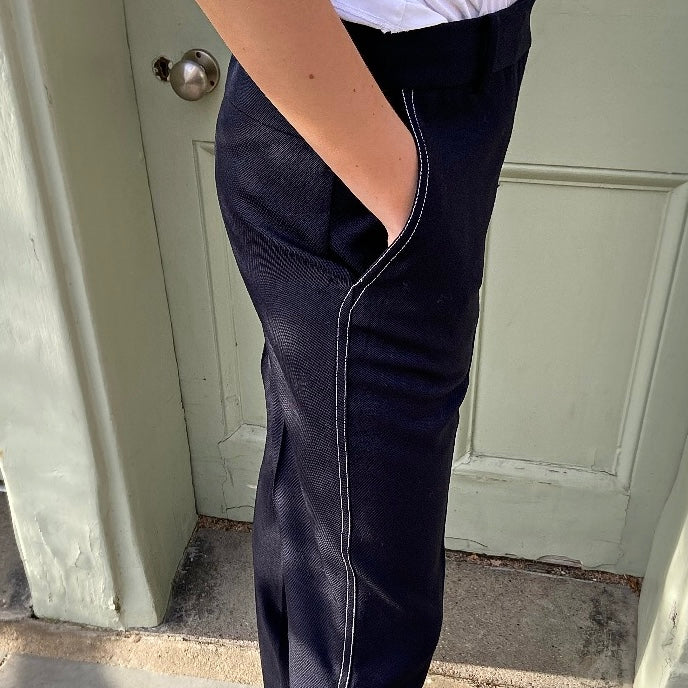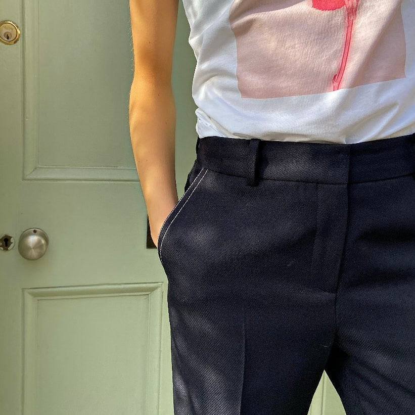 The Kim Trouser features a 70's wide leg with top stitched detailing along the pockets and down the leg. Crafted in a cavalry navy wool, this pieces oozes cool utilitarian look with the finesse of tailoring.
