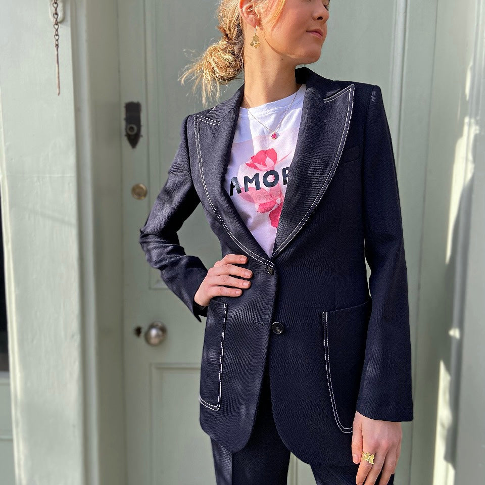 A wonderfully tailored British calvary wool jacket with wide lapels and patch pockets, topstitching for a utilitarian look coming in a classic dark navy shade.