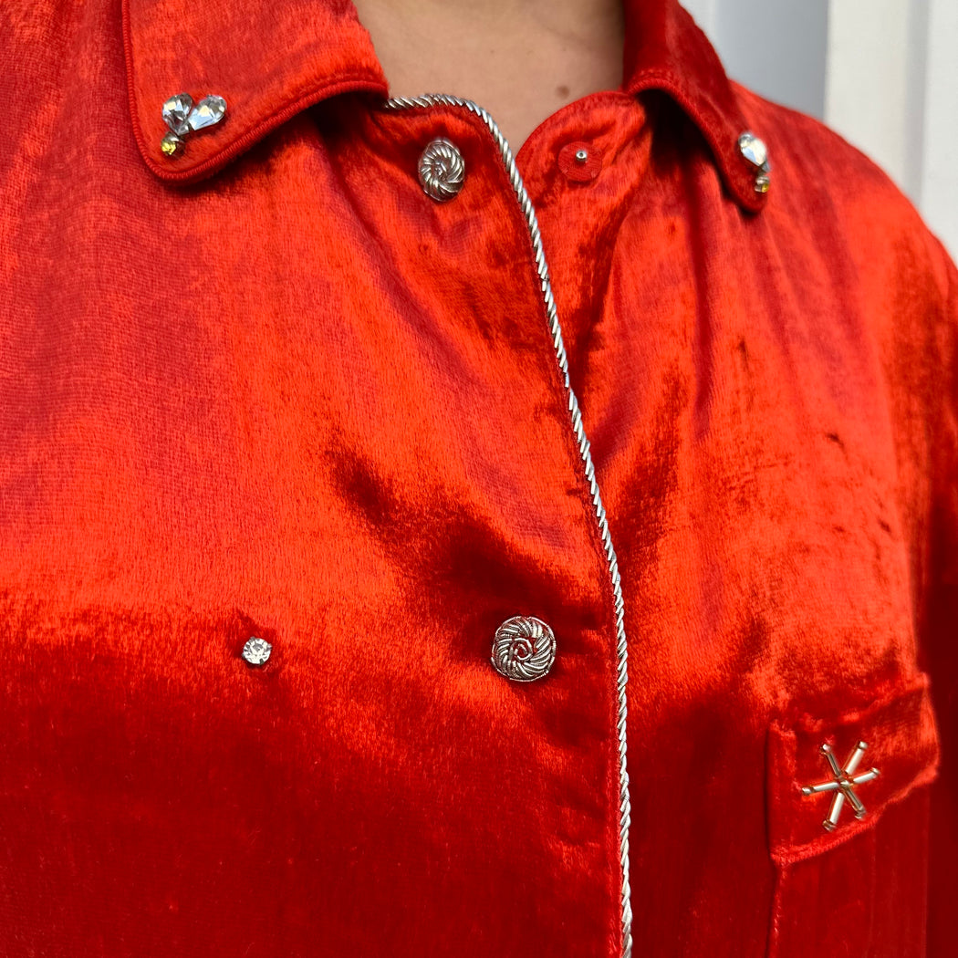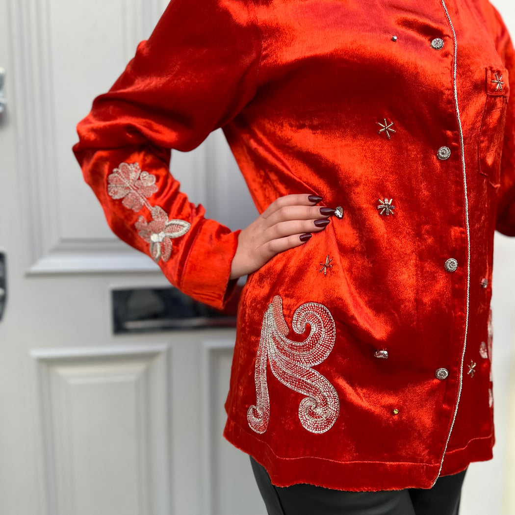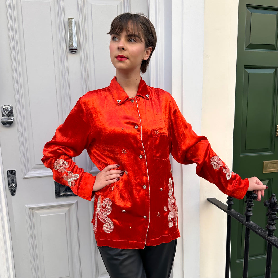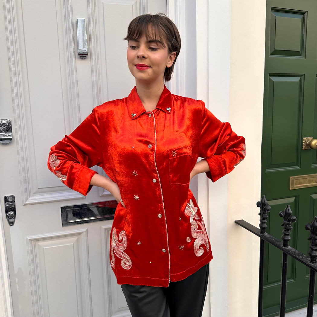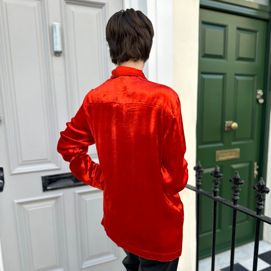 A beautifully intricate embroidered velvet shirt in a popping hibiscus red. A classic loose shirt shape that drapes over the body for a flattering fit.