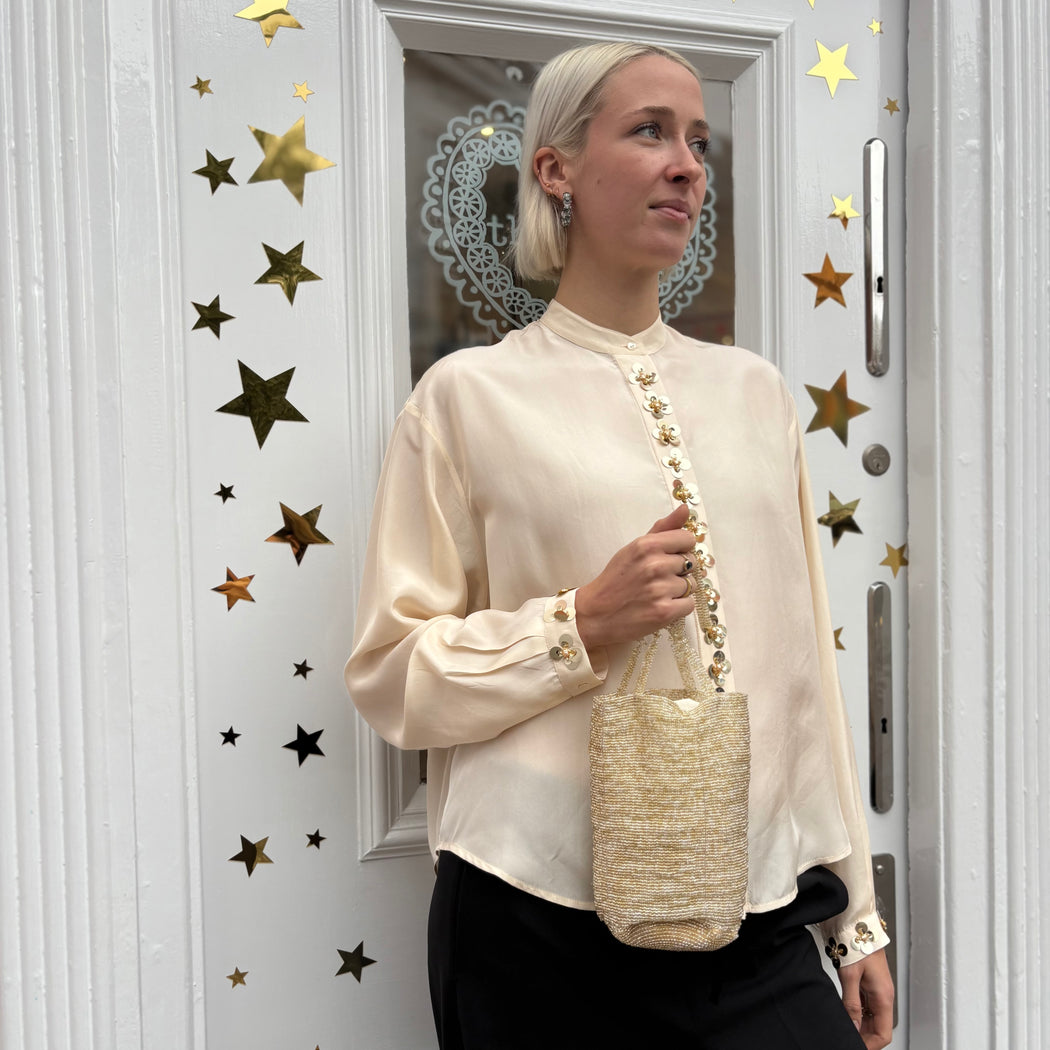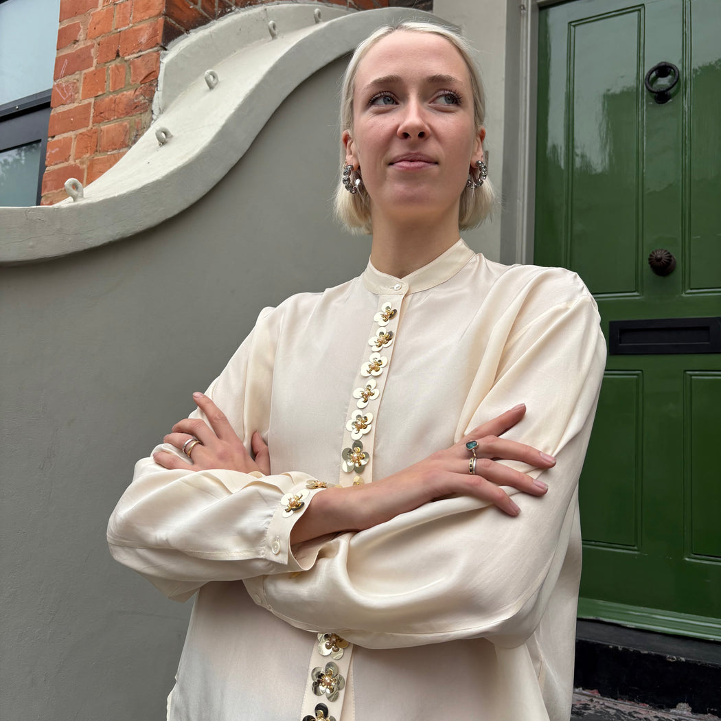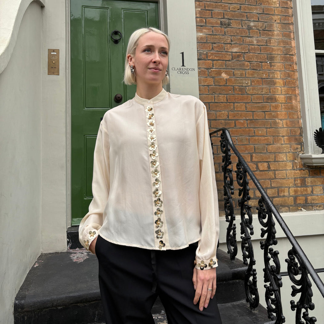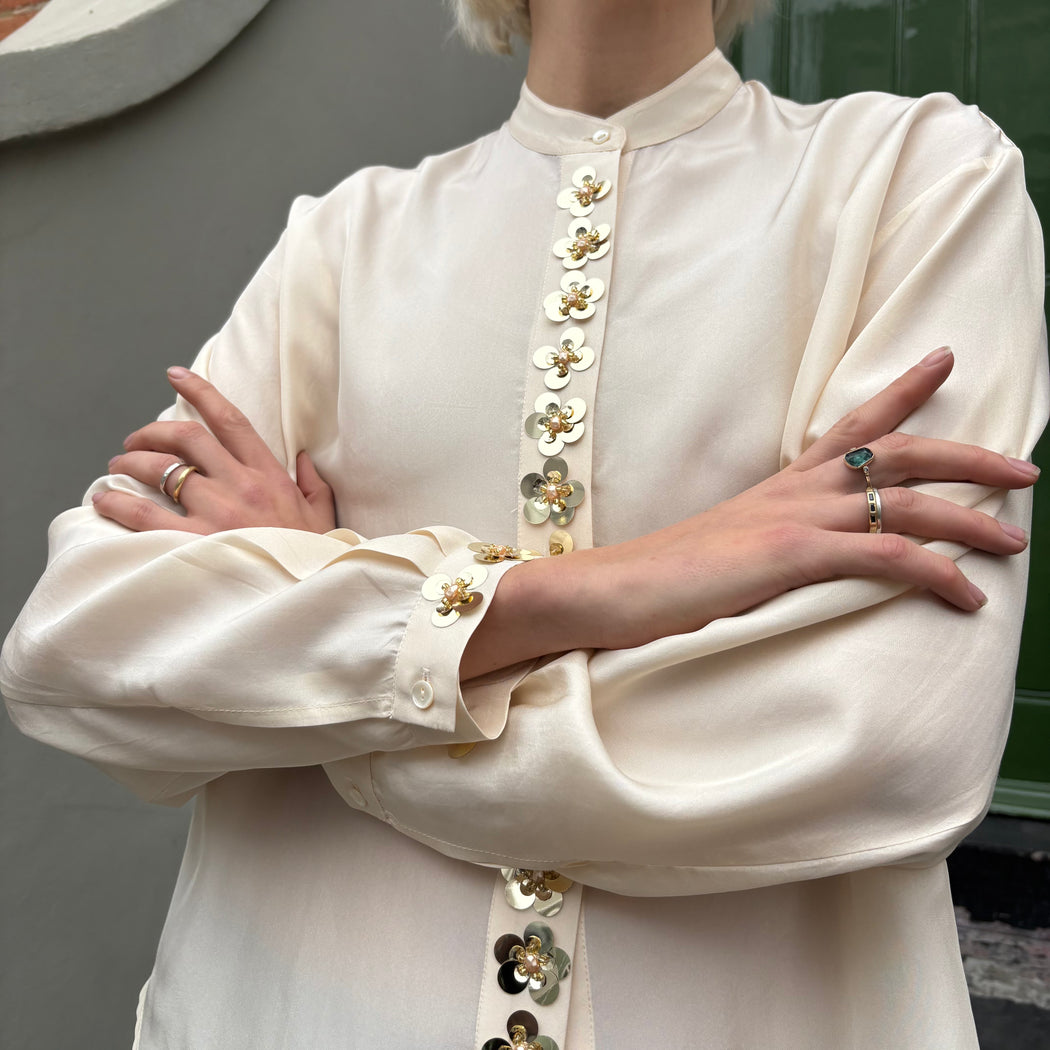 A sequin dream. Habotai silk shirt, a boxy and comfortable fit. Sequin flowers dance down the shirt covering each button.