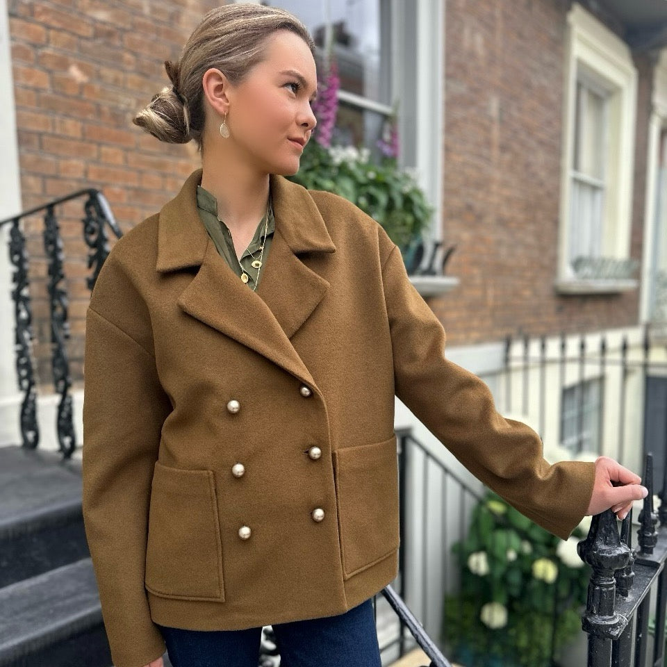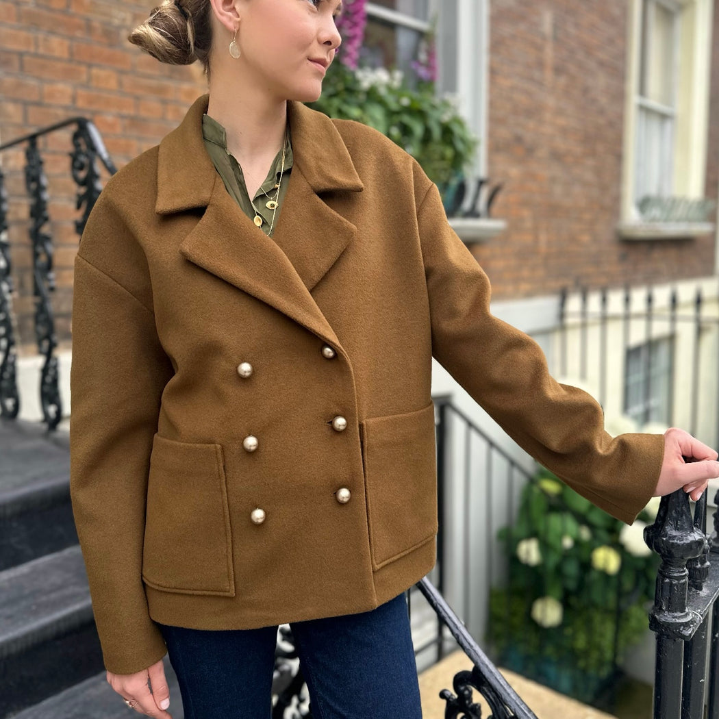 A contemporary take on the classic pea coat, coming in a delicious tobacco colour. Soft to the touch in a cashmere blend, it is finished with polished buttons and patch pockets. This coat fits true to size, with enough room for a cashmere knit in those cooler months.