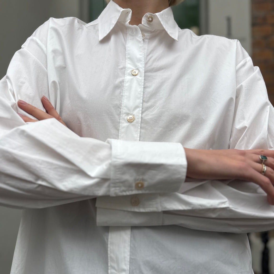 A crisp white cotton shirt in a relaxed classic oversized straight cut. This poplin shirt is meant to be worn oversized as modelled.