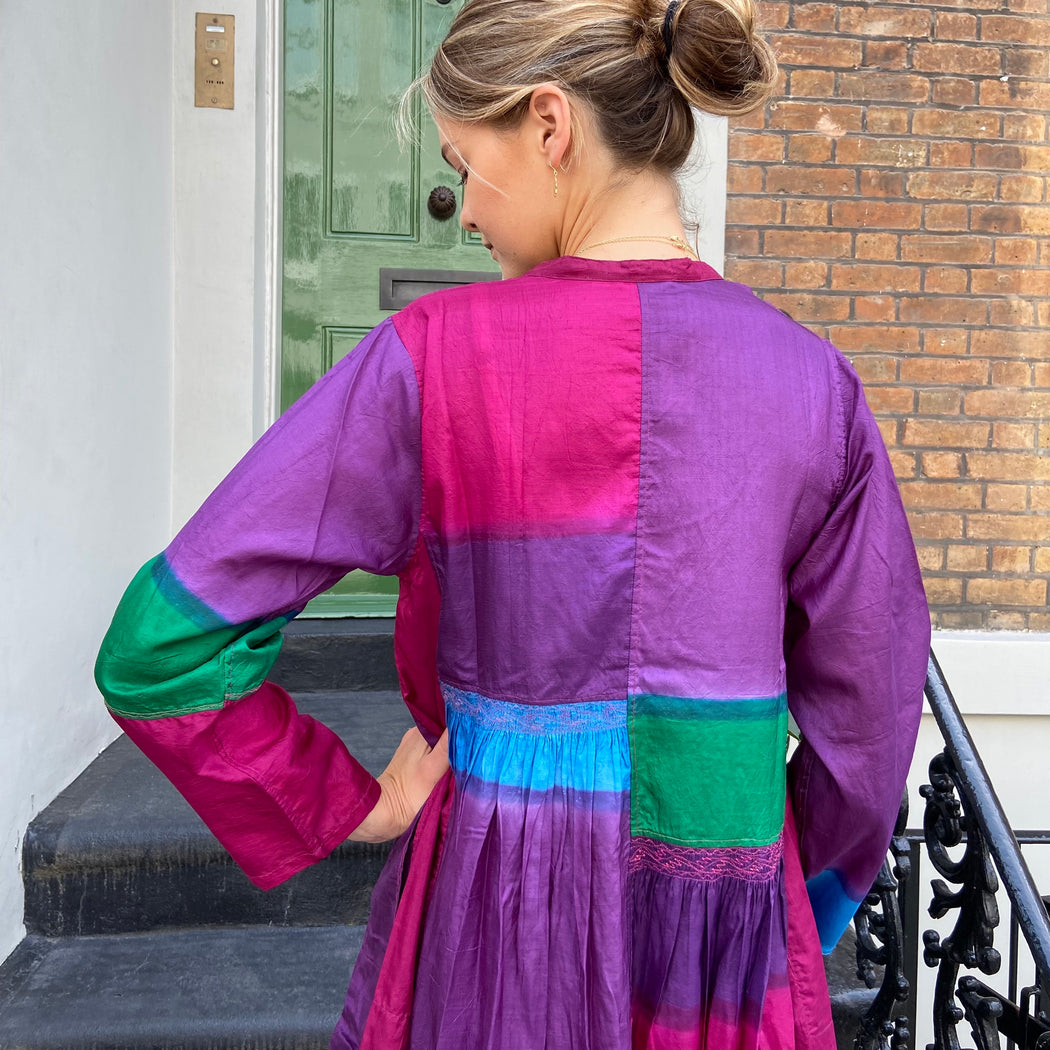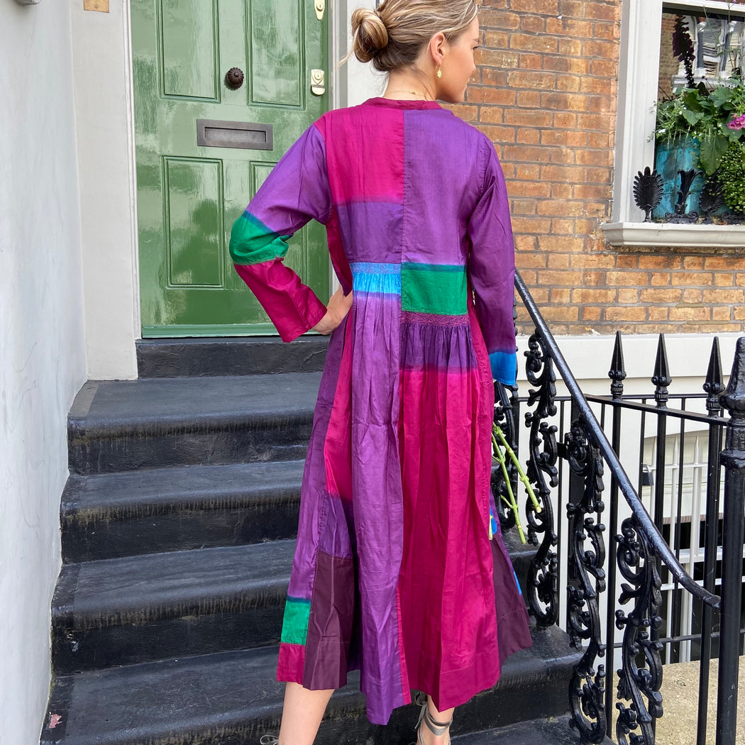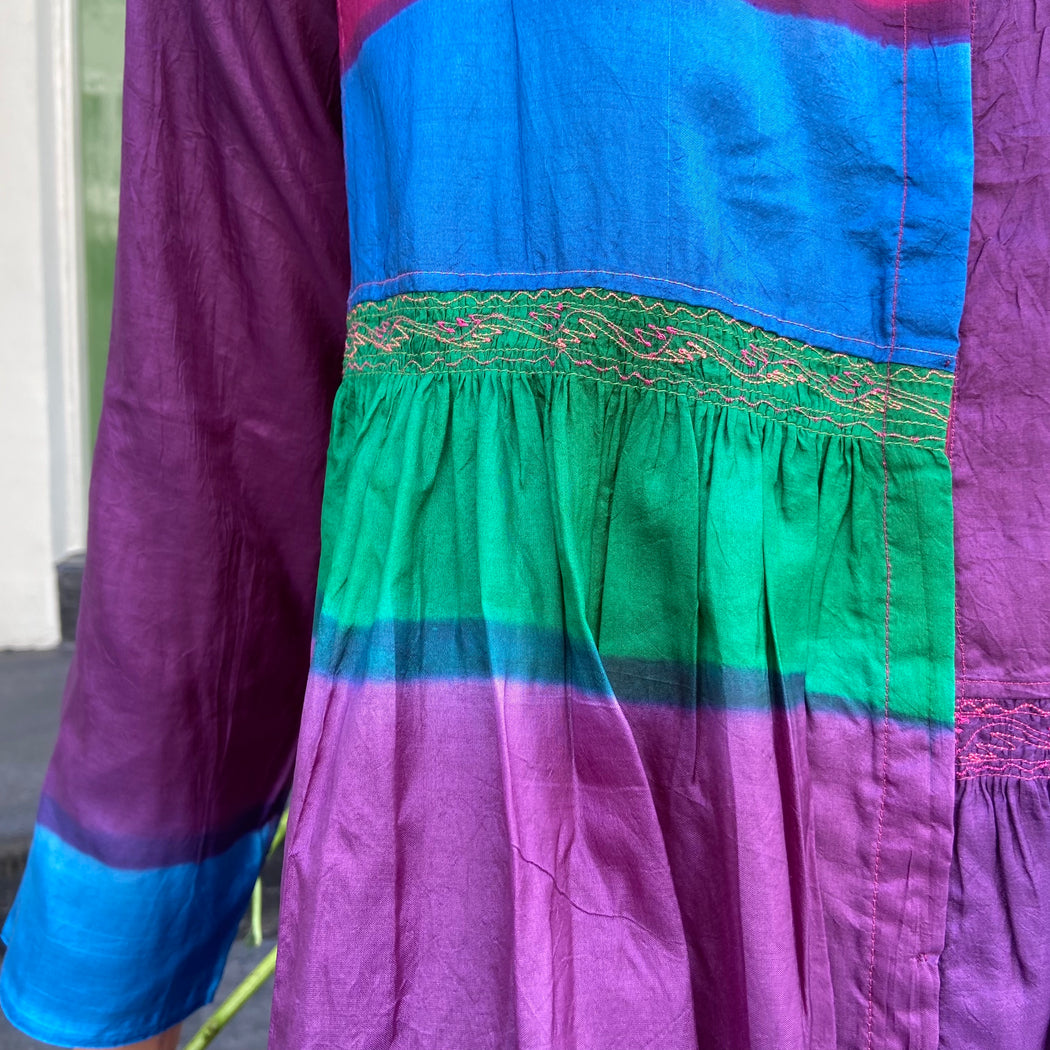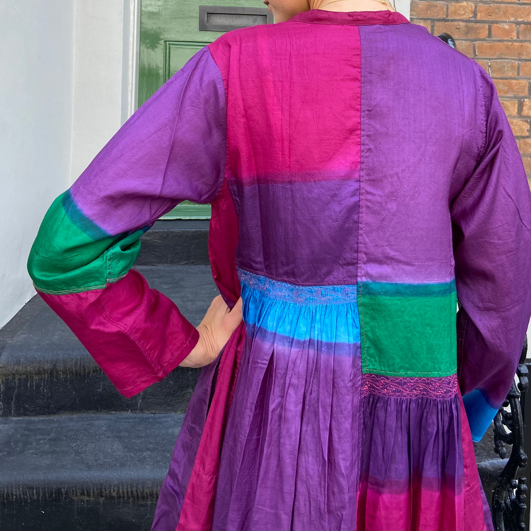 This dress is carefully dyed in exquisite, jewel like colours creating the beautiful patchwork effect. The dress falls below the knee with a double hem that lends weight and swing. It is slightly pleated below the waist and features subtle panels of intricate embroidery. It has a round neck with brass button front closure. Impress the crowd with this stunning piece. Model wears size S