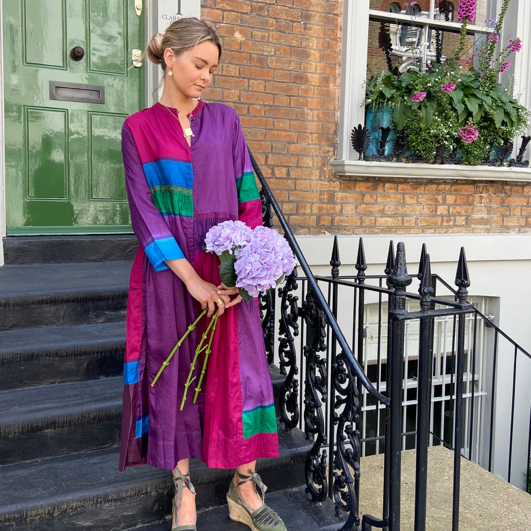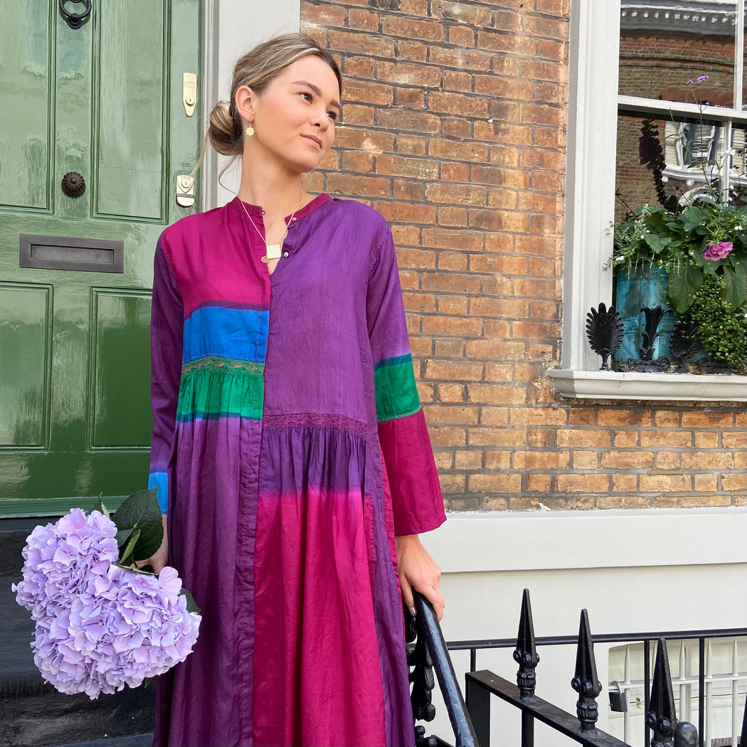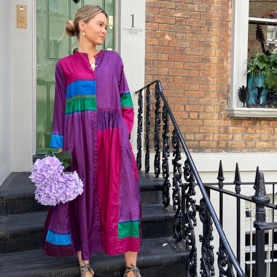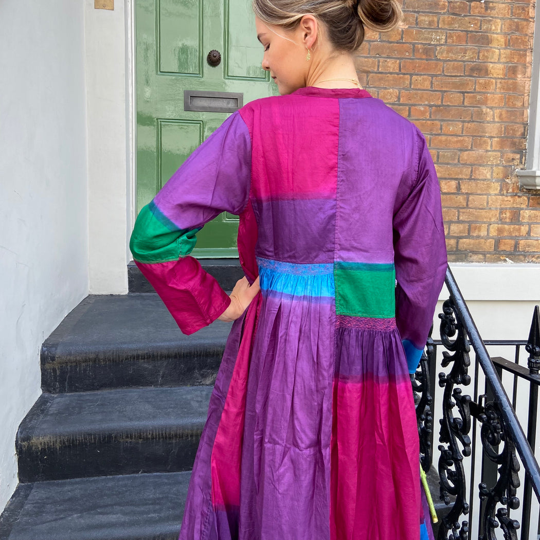 This dress is carefully dyed in exquisite, jewel like colours creating the beautiful patchwork effect. The dress falls below the knee with a double hem that lends weight and swing. It is slightly pleated below the waist and features subtle panels of intricate embroidery. It has a round neck with brass button front closure. Impress the crowd with this stunning piece. Model wears size S