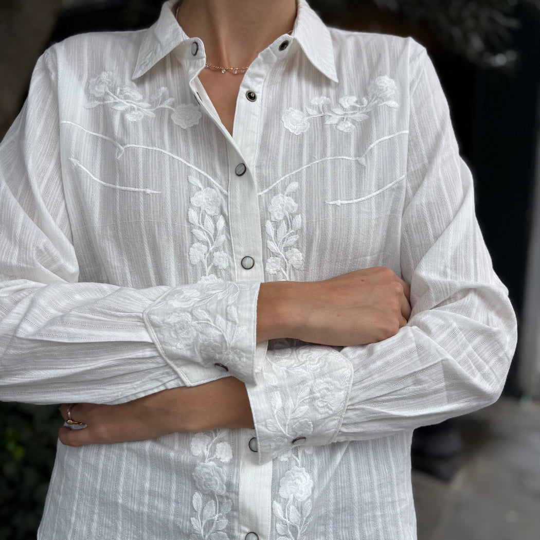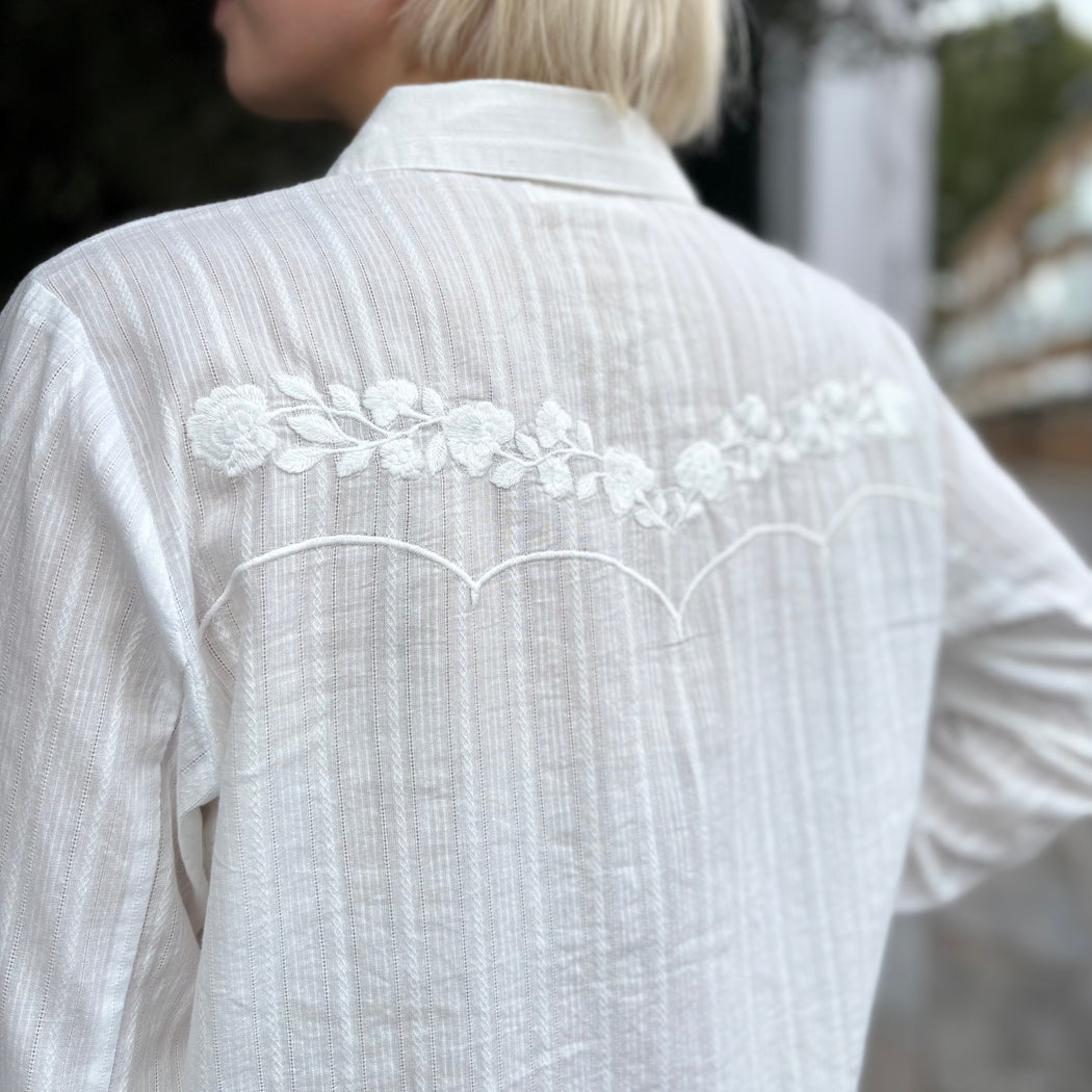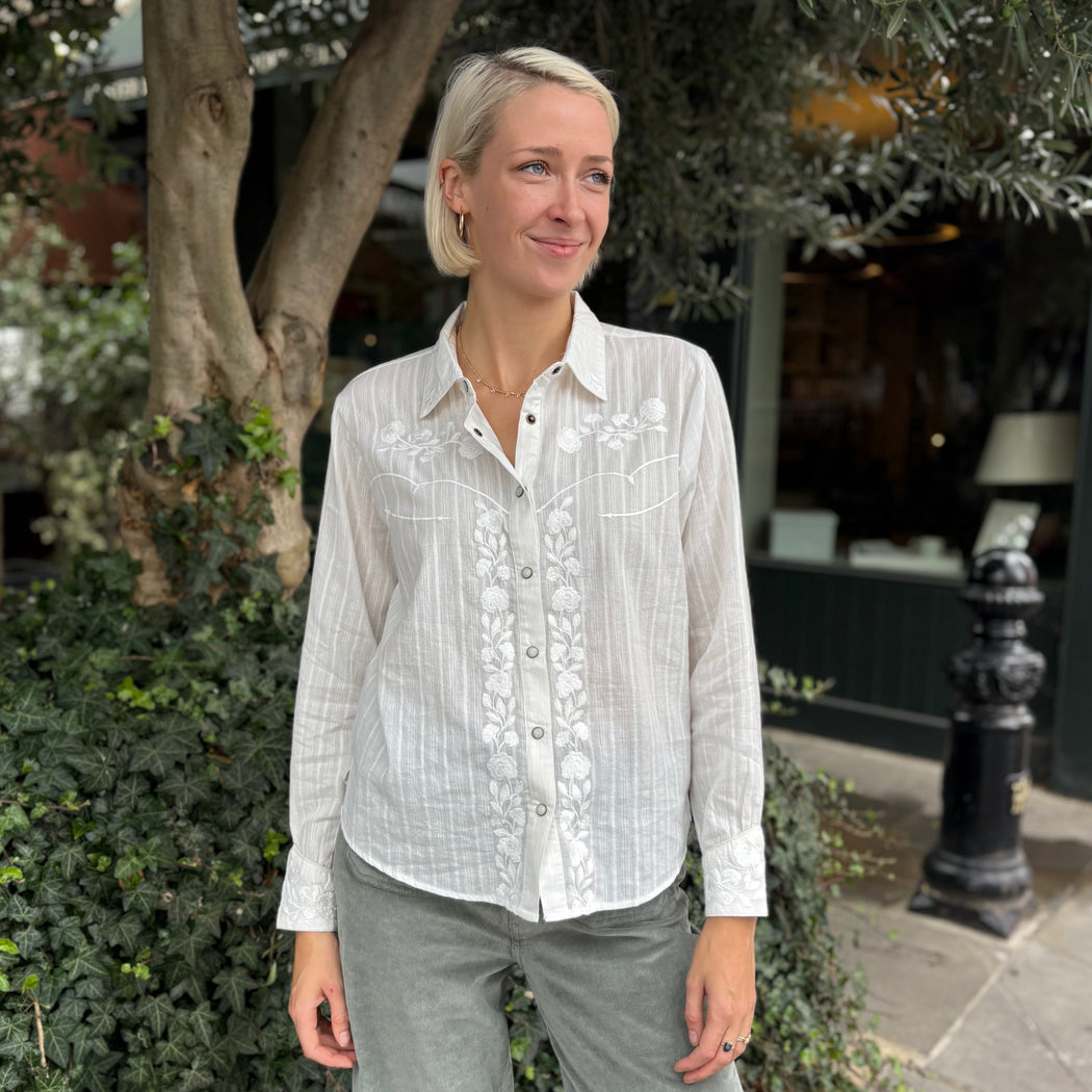 A western style shirt with pop buttons and white embroidery. A relaxed and easy shape, true to size.