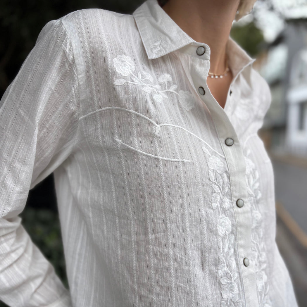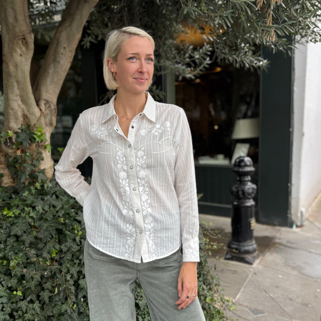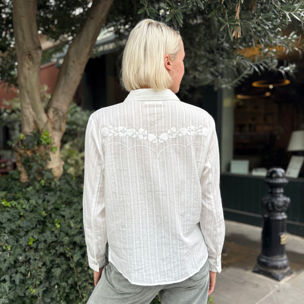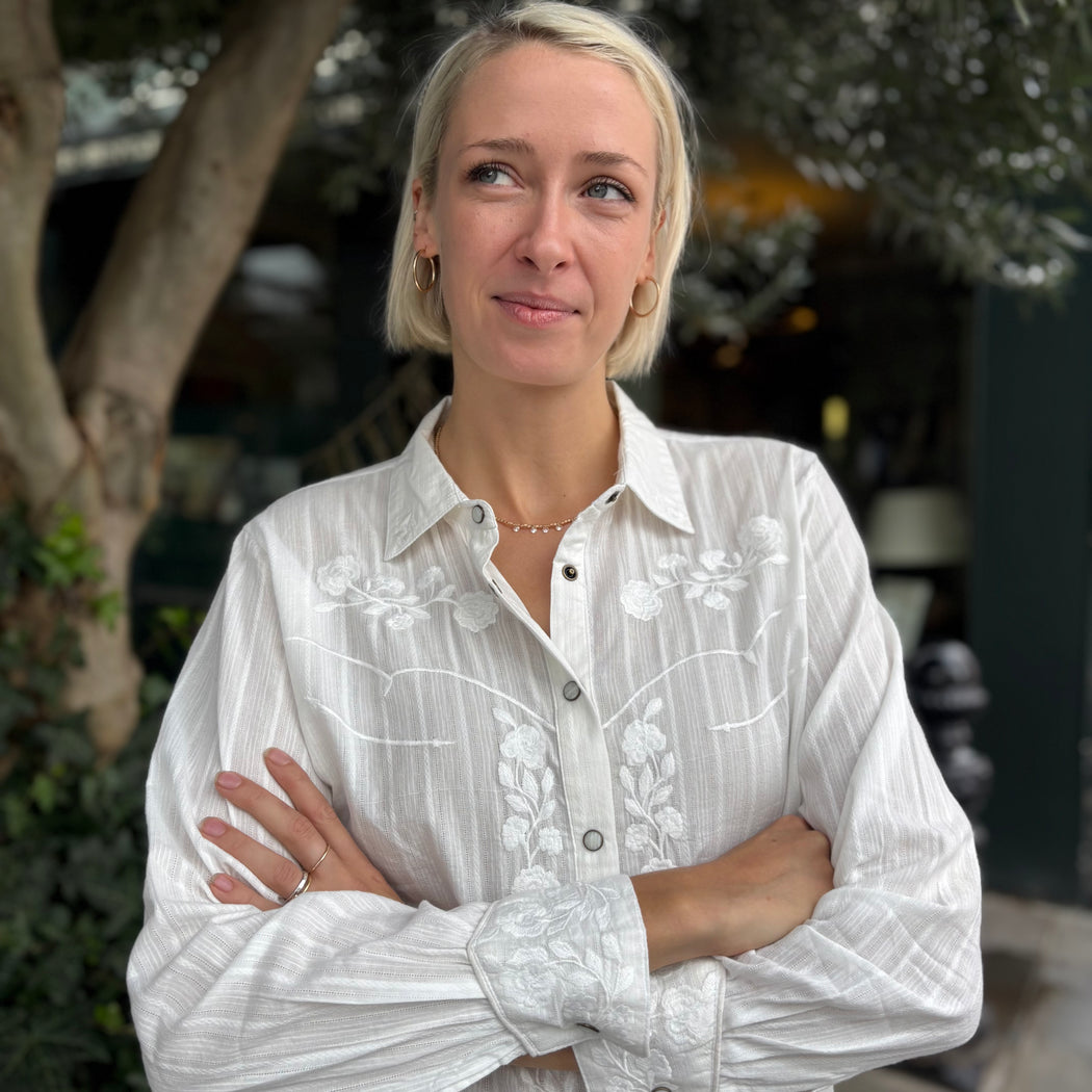 A western style shirt with pop buttons and white embroidery. A relaxed and easy shape, true to size.