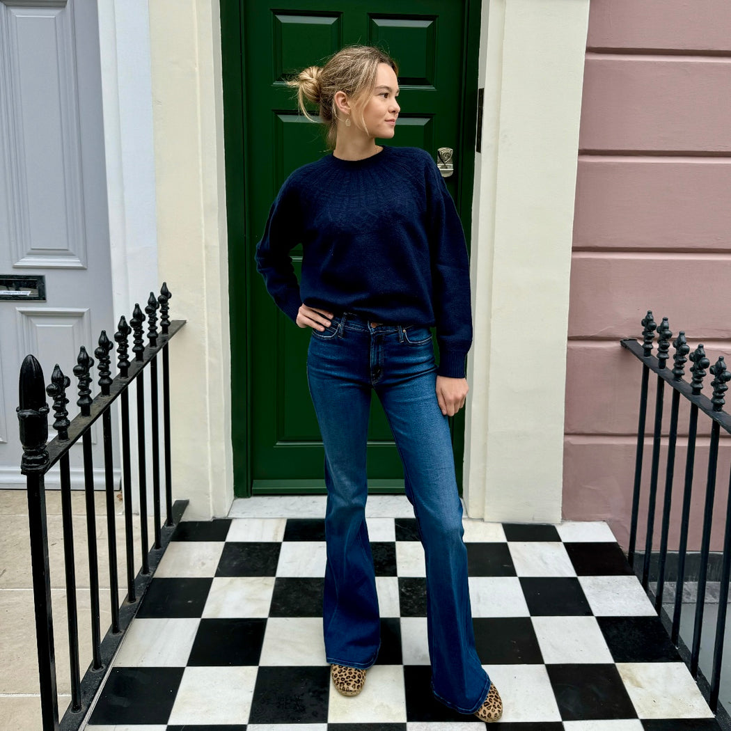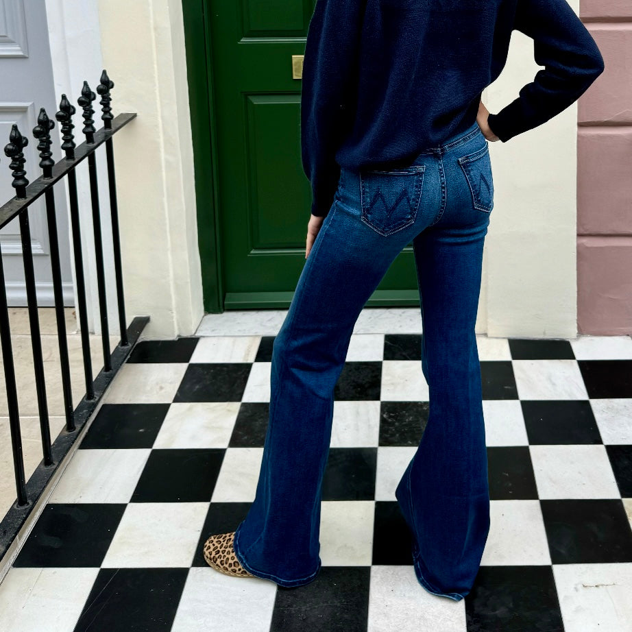 high-rise flare with a long 34-inch inseam and a clean hem. Cut from denim with a touch of stretch, Uncharted Waters is a dark blue wash with whiskering and fading at the knee.
