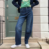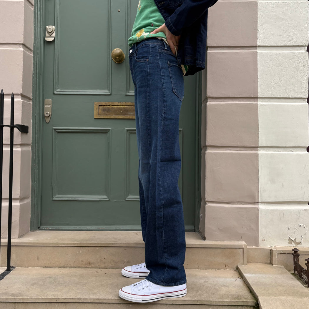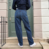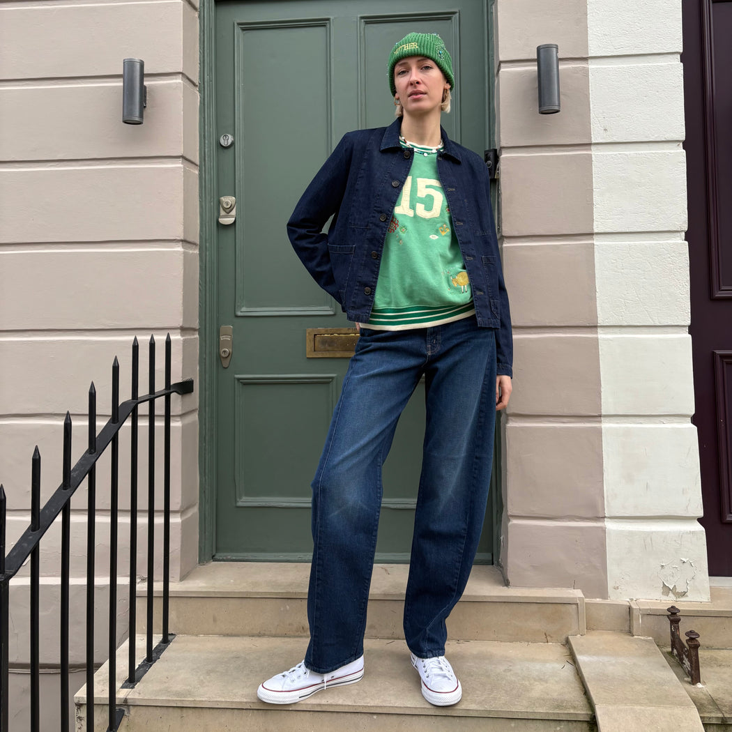 Jeans designed to sit lower on the hips with a wide, full barrel leg, zip fly, a long 31-inch inseam and a clean hem. Made from semi-rigid SUPERIOR denim, Kicks And Riffs is a dark blue with subtle fading and whiskering.
