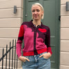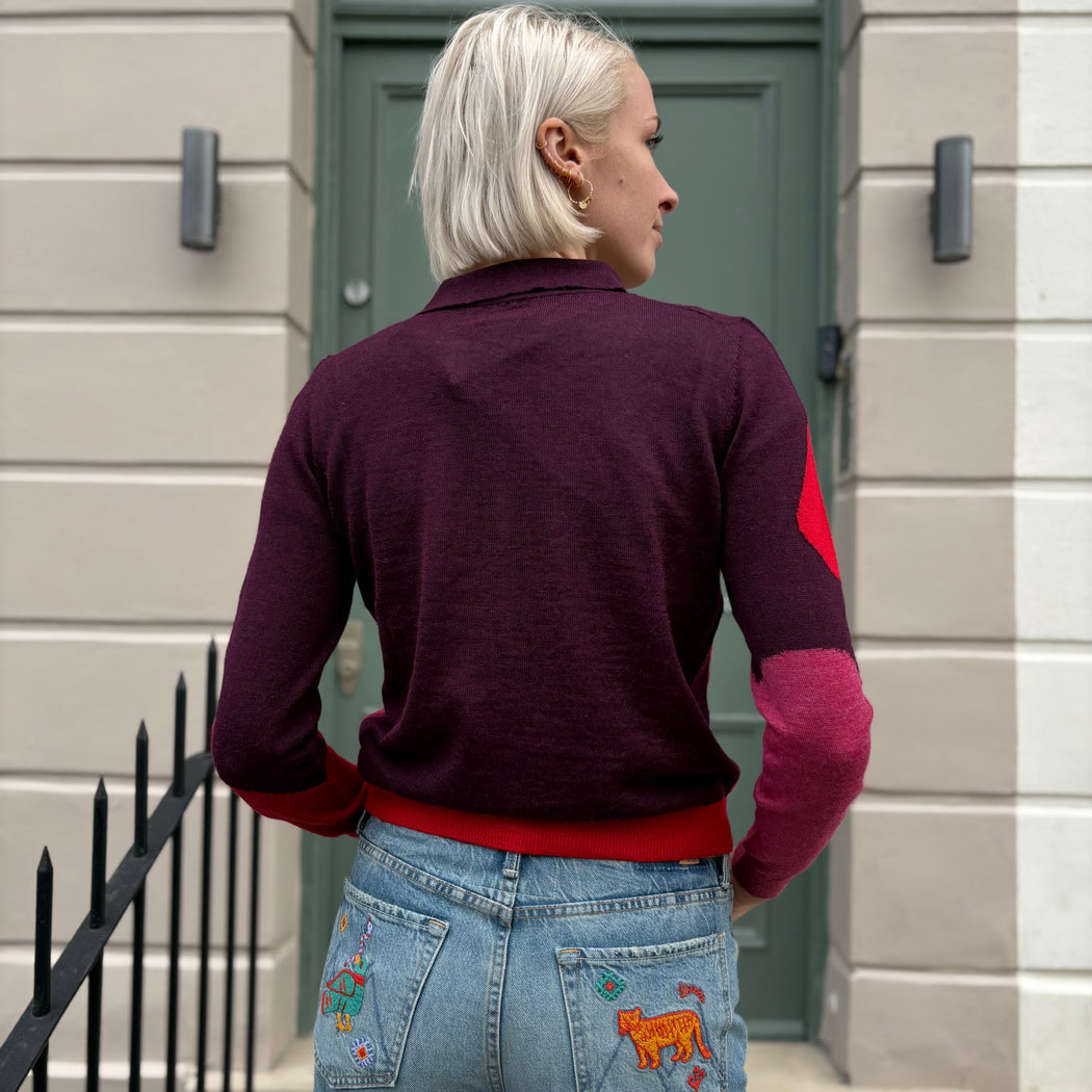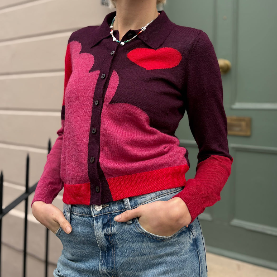 A collared cardigan sweater with long sleeves, ribbed hems and a loose fit. Made from 100% alpaca, Pop Art is a maroon and pink graphic print with red details and a heart on the chest.