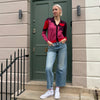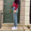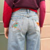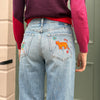 Jeans designed to sit on the hips with a slouchy fit, a loose straight leg, zip fly and a 28.25-inch inseam with a clean hem. Cut from rigid SUPERIOR denim, That's All Folks is a mid-blue with whiskering, fading at the knees and embroidery on the back pockets.
