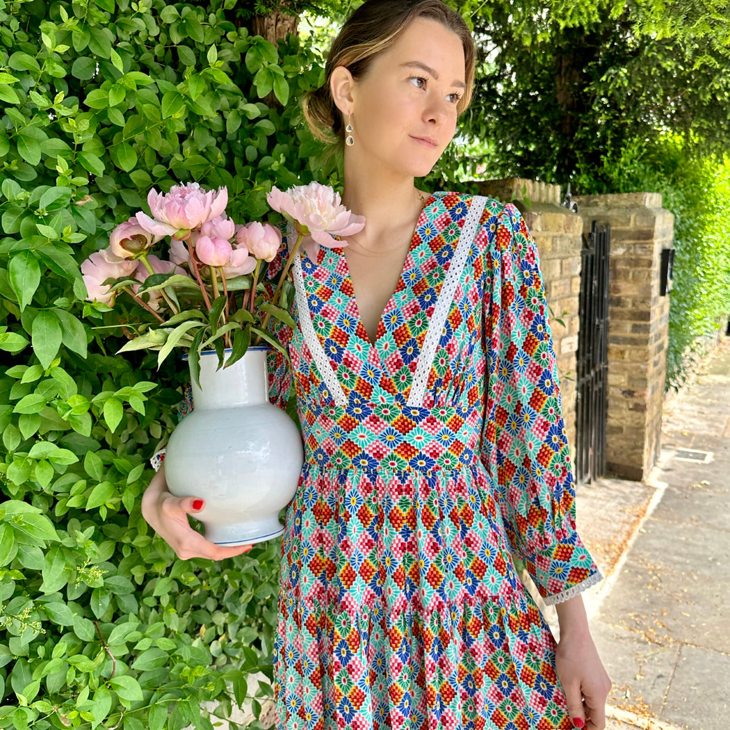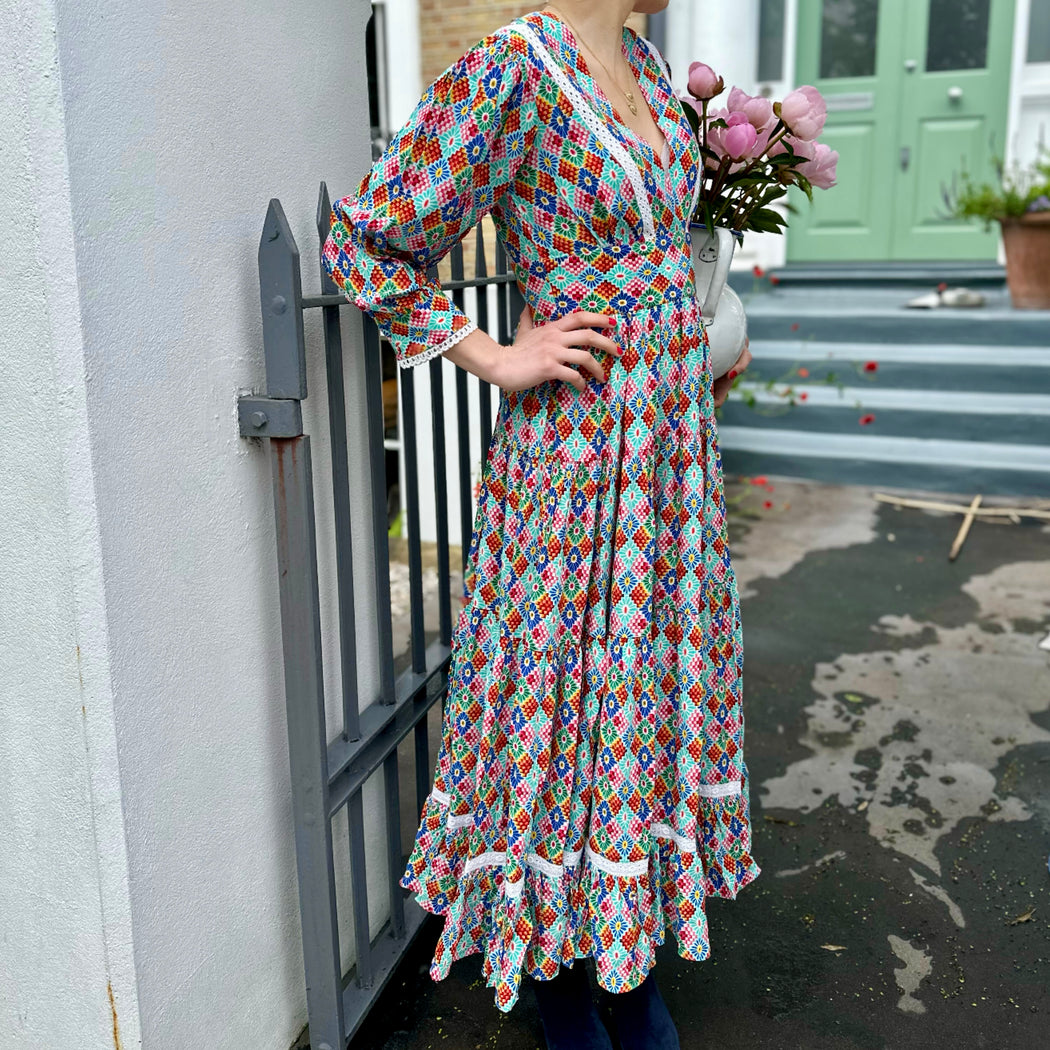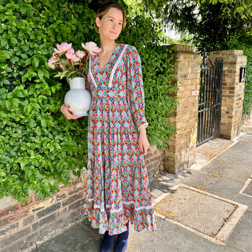 This beautiful dress is carefully handmade and hand embroidered in India. The delicate embroidery is done by a group of talented women in Mumbai. The Frangipani dress features a V-neckline 3/4 length sleeves with a slight balloon and a full length skirt.
