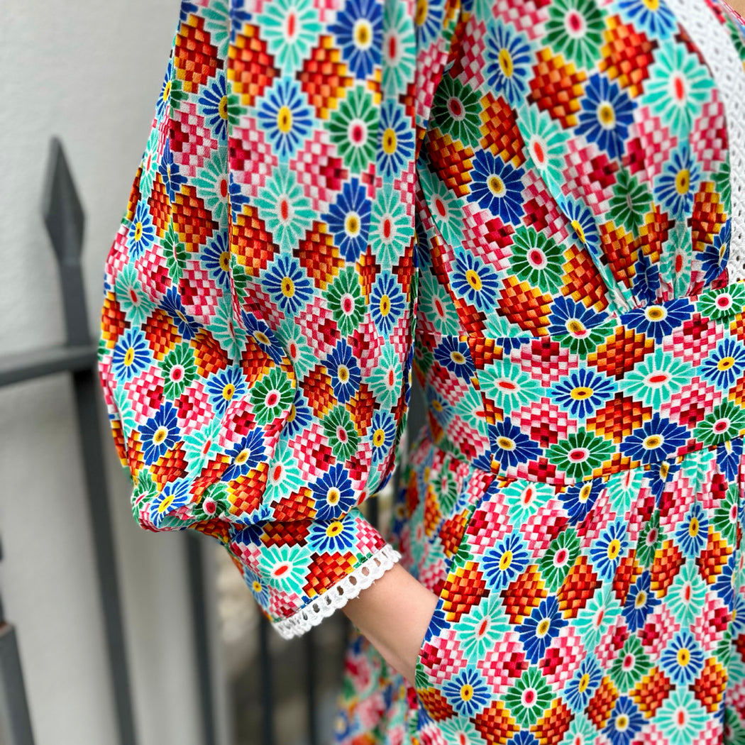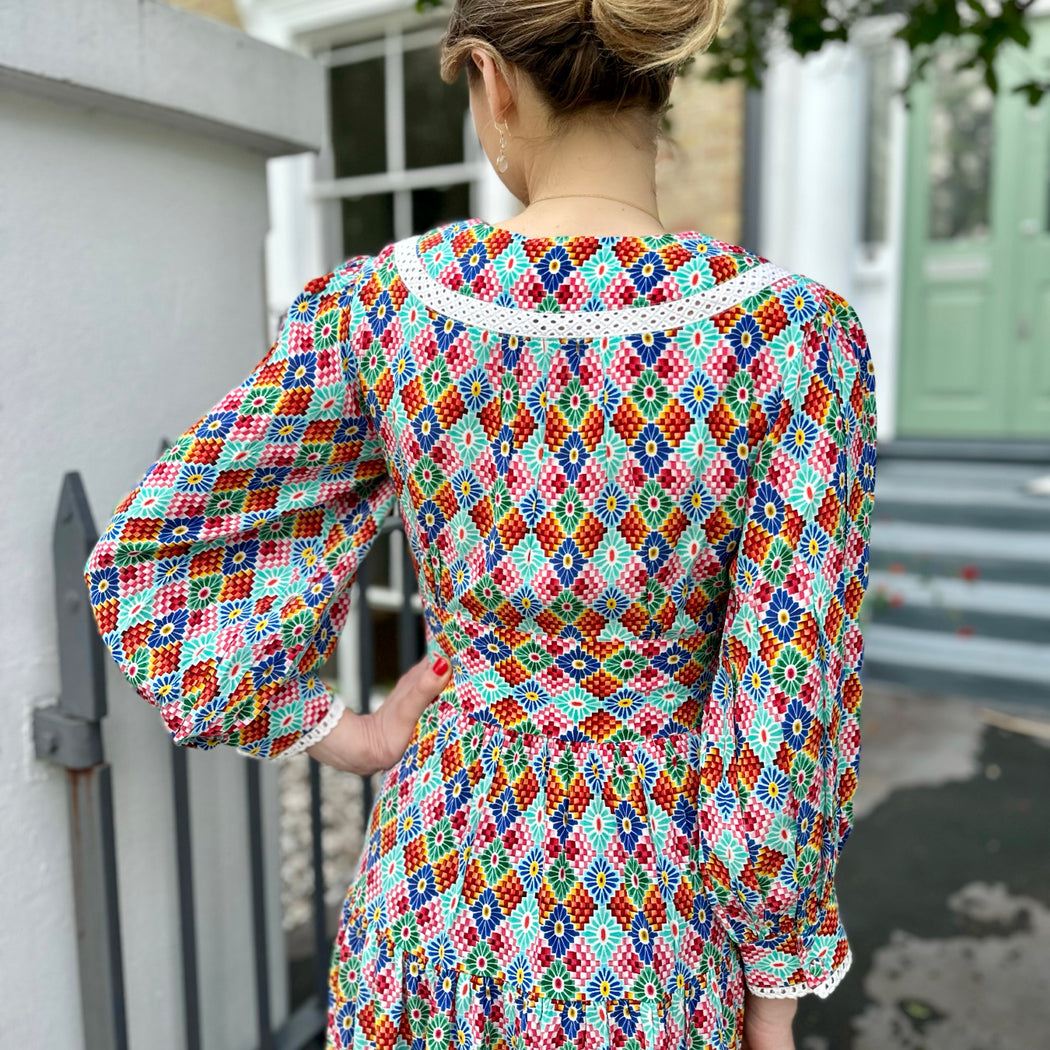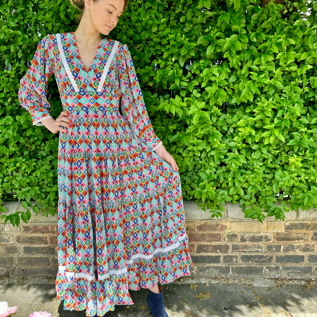 This beautiful dress is carefully handmade and hand embroidered in India. The delicate embroidery is done by a group of talented women in Mumbai. The Frangipani dress features a V-neckline 3/4 length sleeves with a slight balloon and a full length skirt.