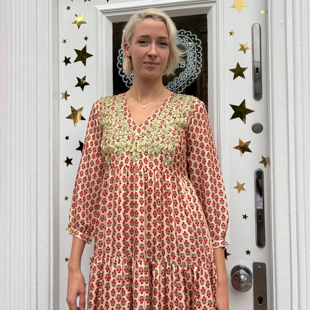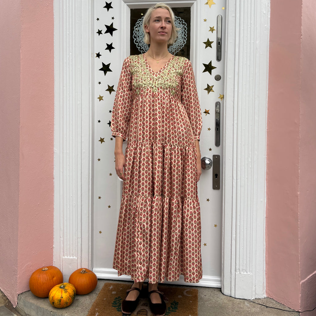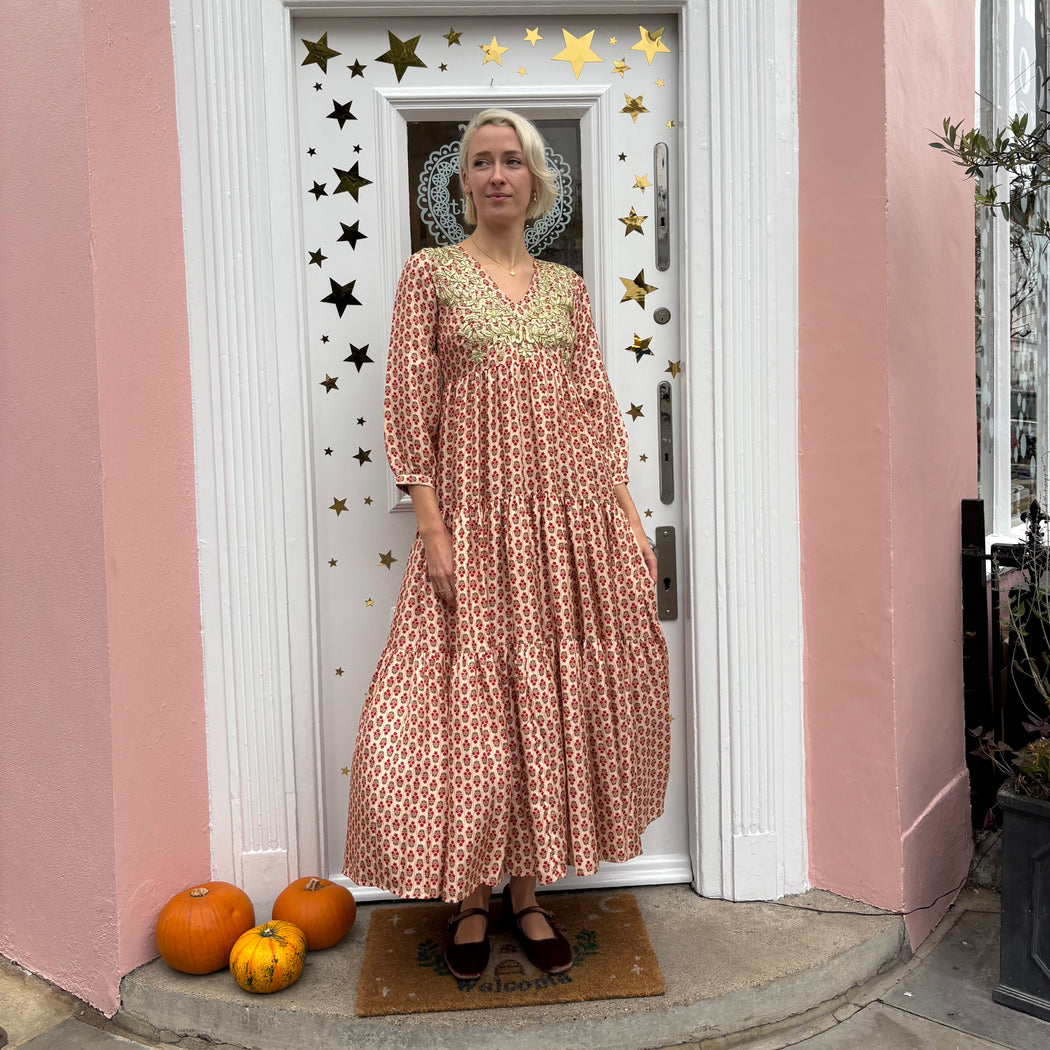 This beautiful dress is carefully handmade and hand embroidered in India. The delicate embroidery is done by a group of talented women in Mumbai. The Frangipani dress features a V-neckline 3/4 length sleeves with a slight balloon and a full length skirt.