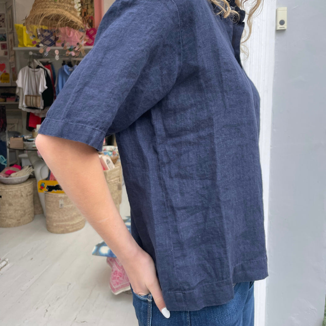 Relaxed linen shirt. Short sleeves, button closure down the front.