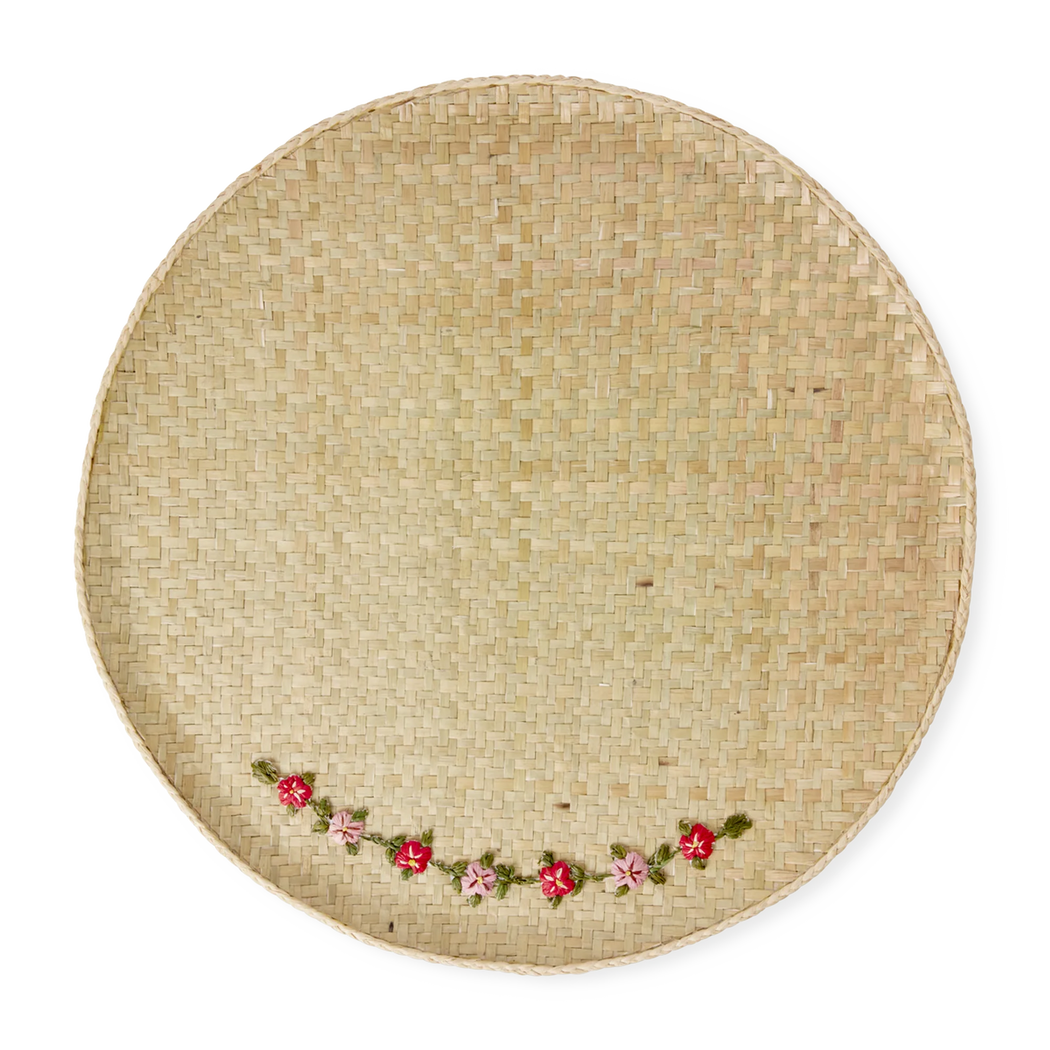 Large, round raffia tray with a gorgeous flower wine in pink shades. Perfect for serving a lovely snack, breakfast in bed with a loved one or for creating a decorative display with candleholders, small vases, and flowers.