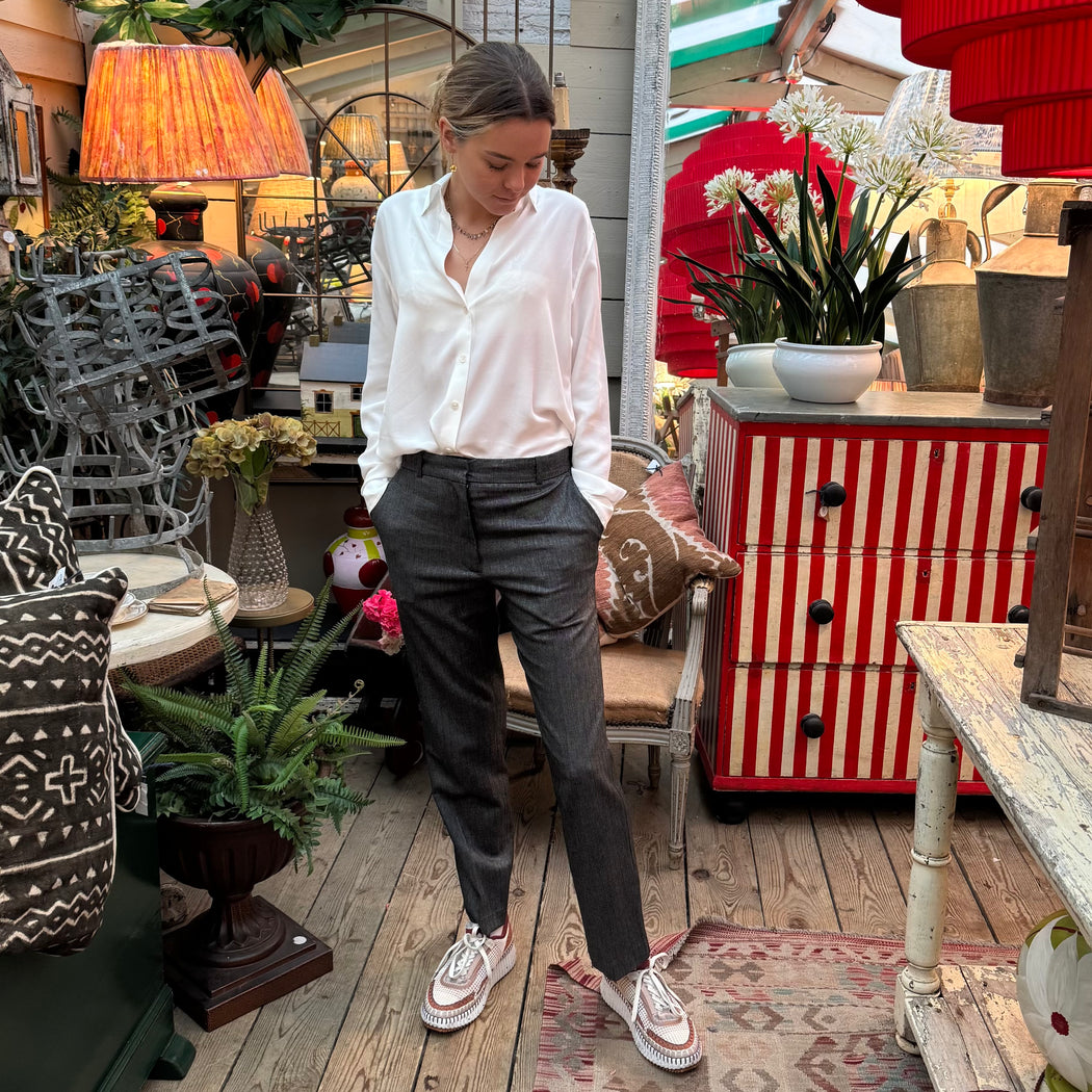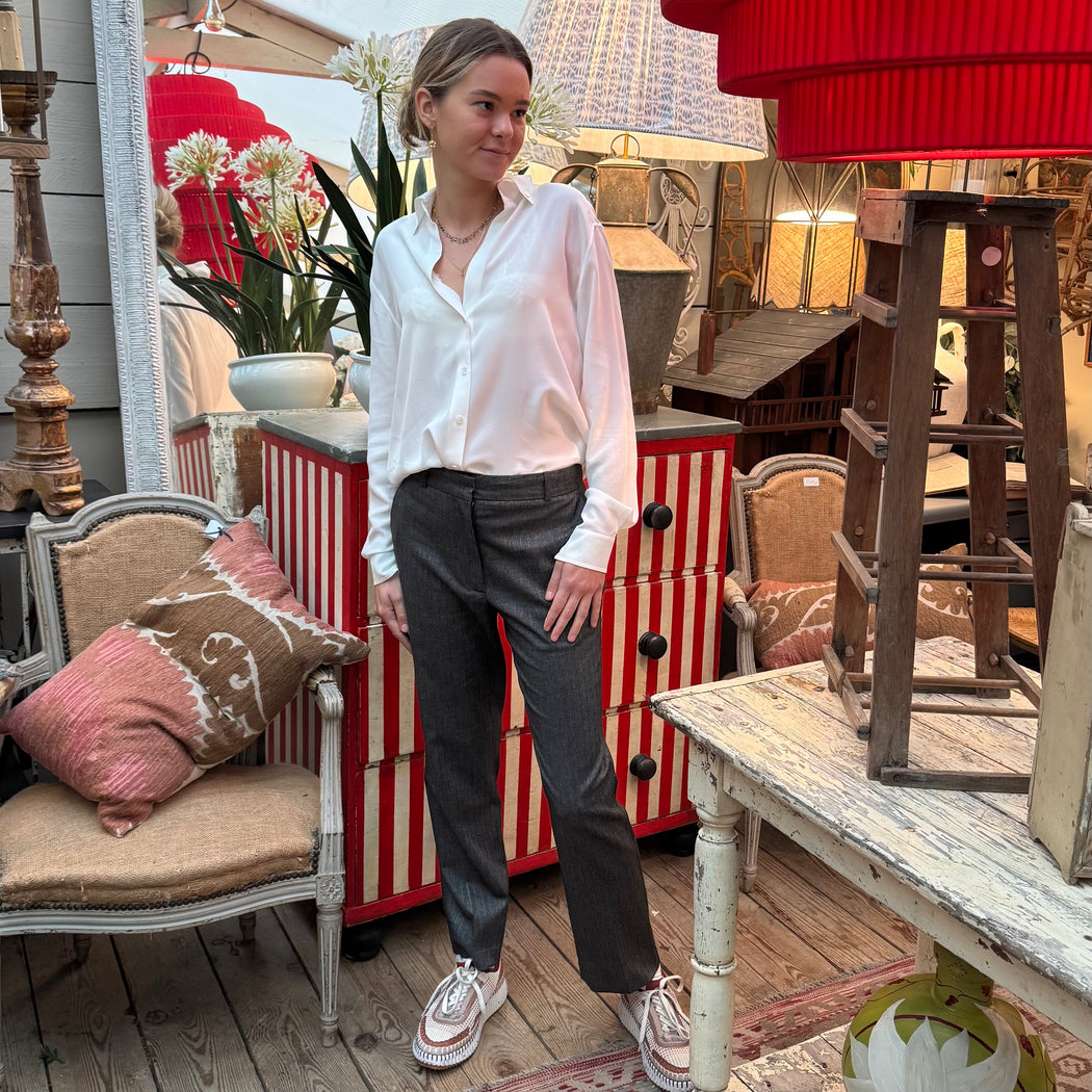 Dandy pants are a must-have for your capsule wardrobe. They are a straight cut, which falls just above the ankle. They revisit the classic men's tailored pant for a more feminine look, accentuated by subtle pleats at the front and back. Wear them with a simple shirt for a casual look, or pair them with a black suit jacket for sophisticated office wear.