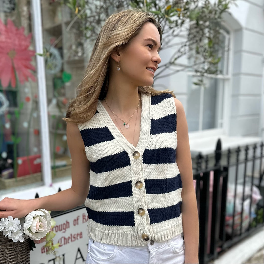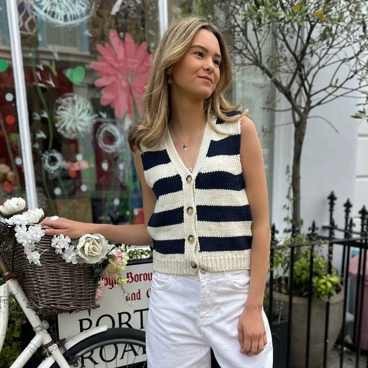 This chunky tank gives us all things summer! A classic think stripe in a navy and cream, with a V neckline and button closure, we love it worn with as is with Vanessa Brunos Caleb jeans!