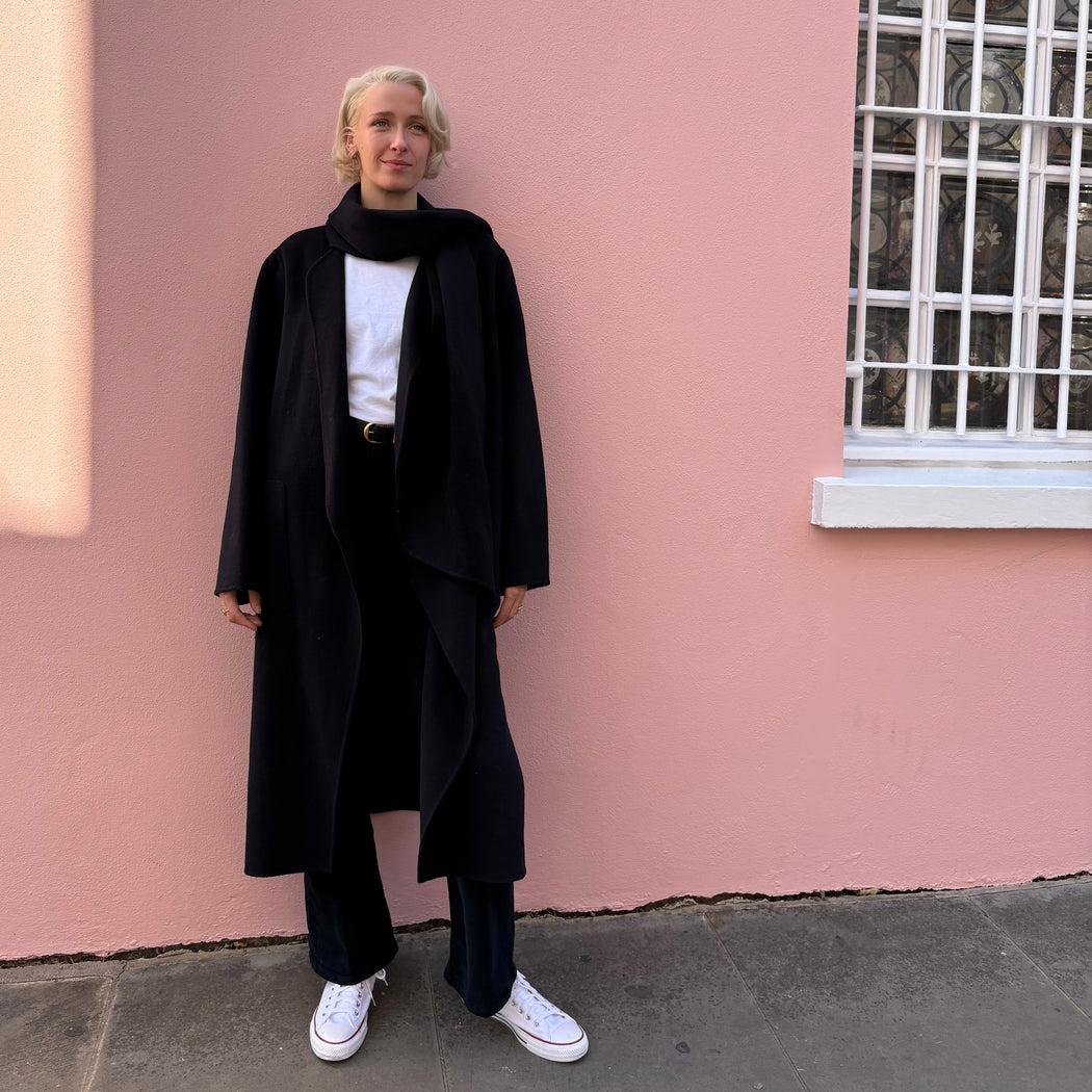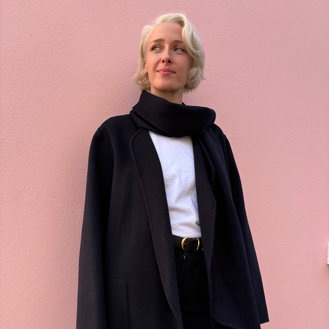 hThe Valeran coat is crafted in a double-faced wool to create a warm, light piece. A beautiful drape to this piece with an added detachable accessory to use as a wrap around scarf. This coat fits true to size, take your normal size.