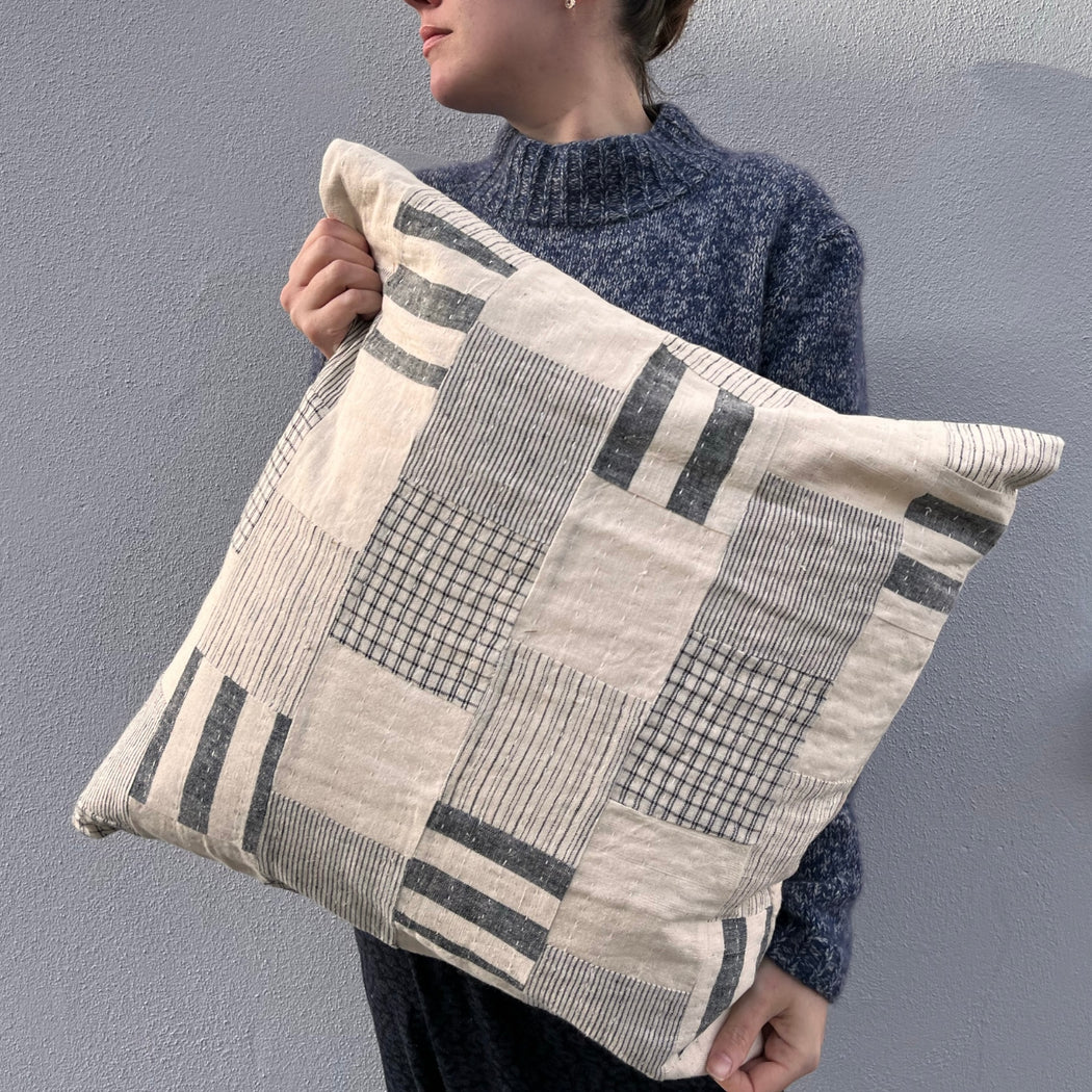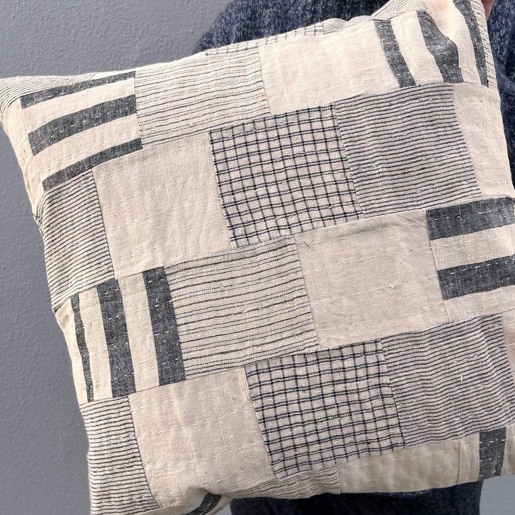 The Patch cushion cover is made of hand-woven organic cotton. The front is made in patchwork technique, where the surface is covered with hand-sewn stitches.