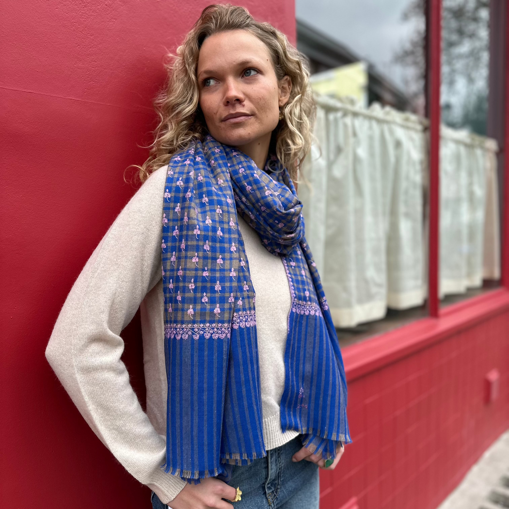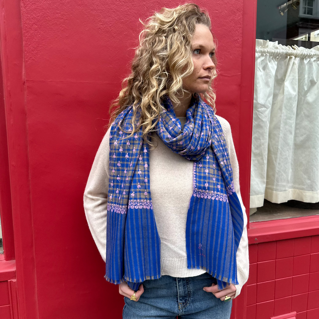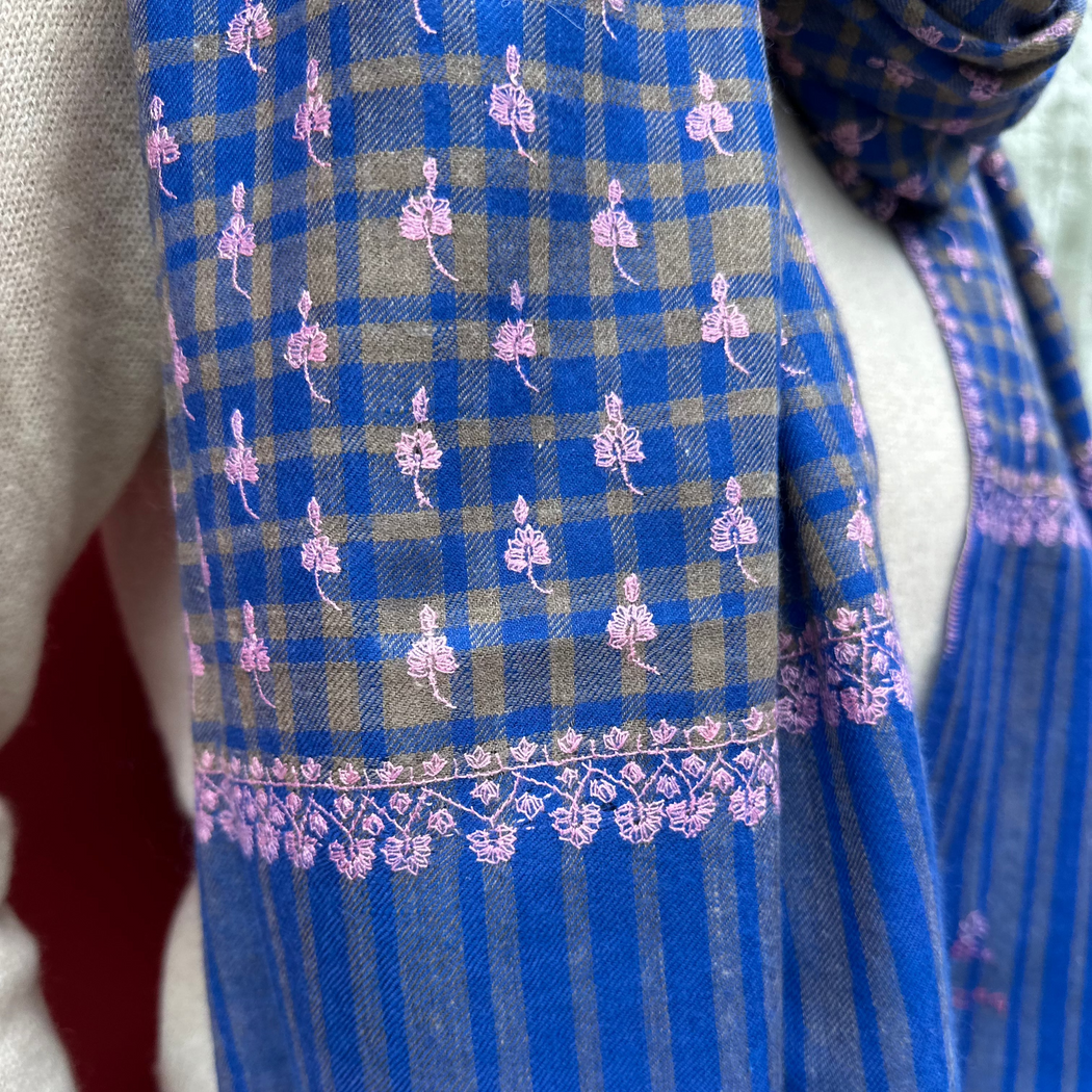 Yaser Shaw Bright Blue and Beige Pink Embroidered Shawl
