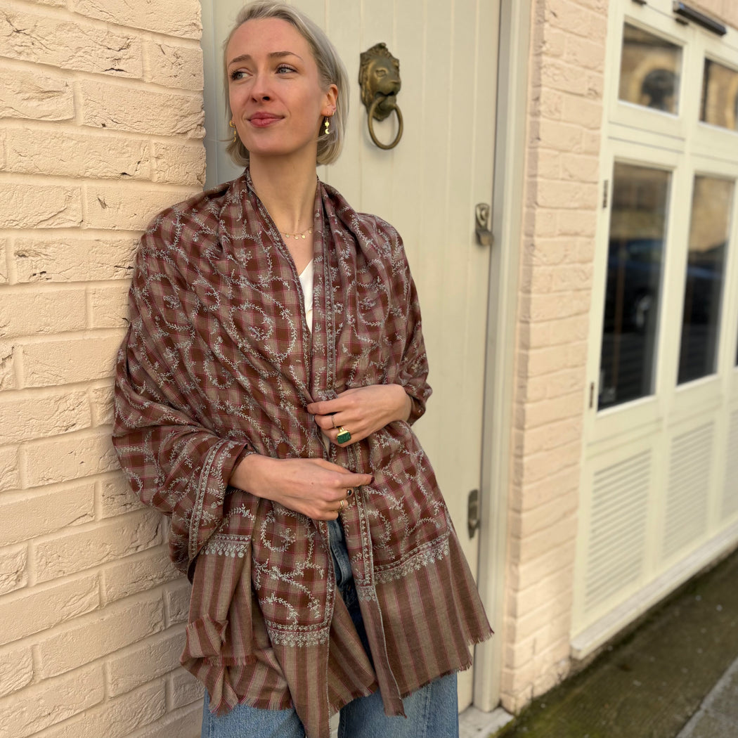 Yaser Shaw Brown and Pink Check Vine Embroidered Shawl My cart