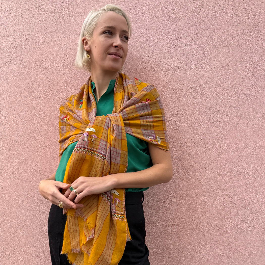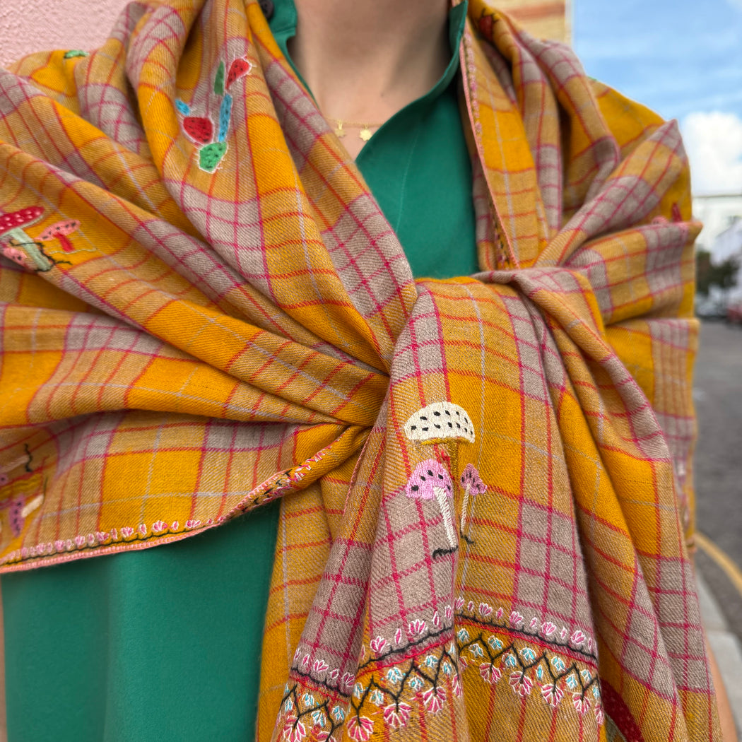 Yaser Shaw Marigold Check Toadstool Embroidered Small Shawl My cart