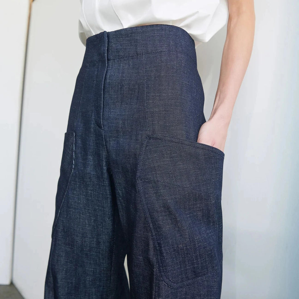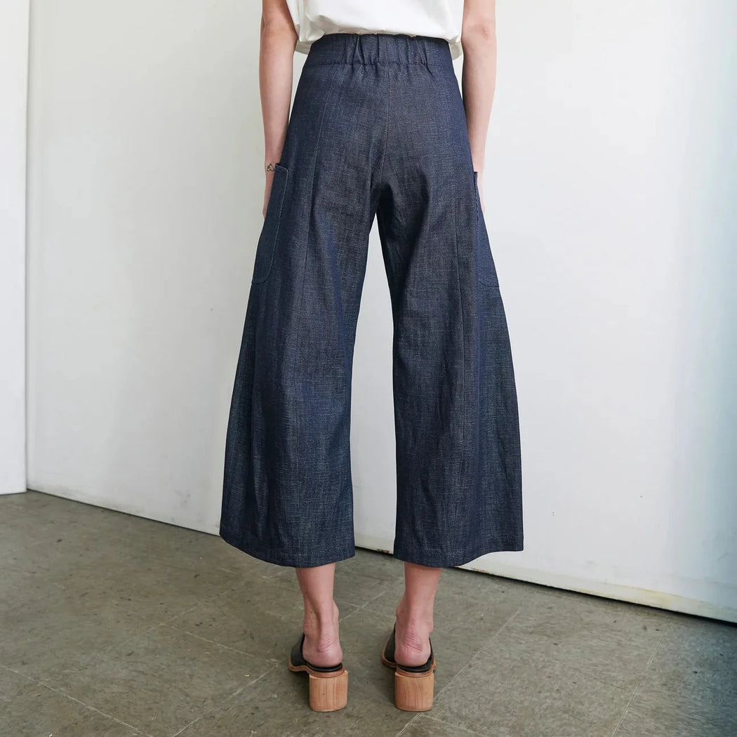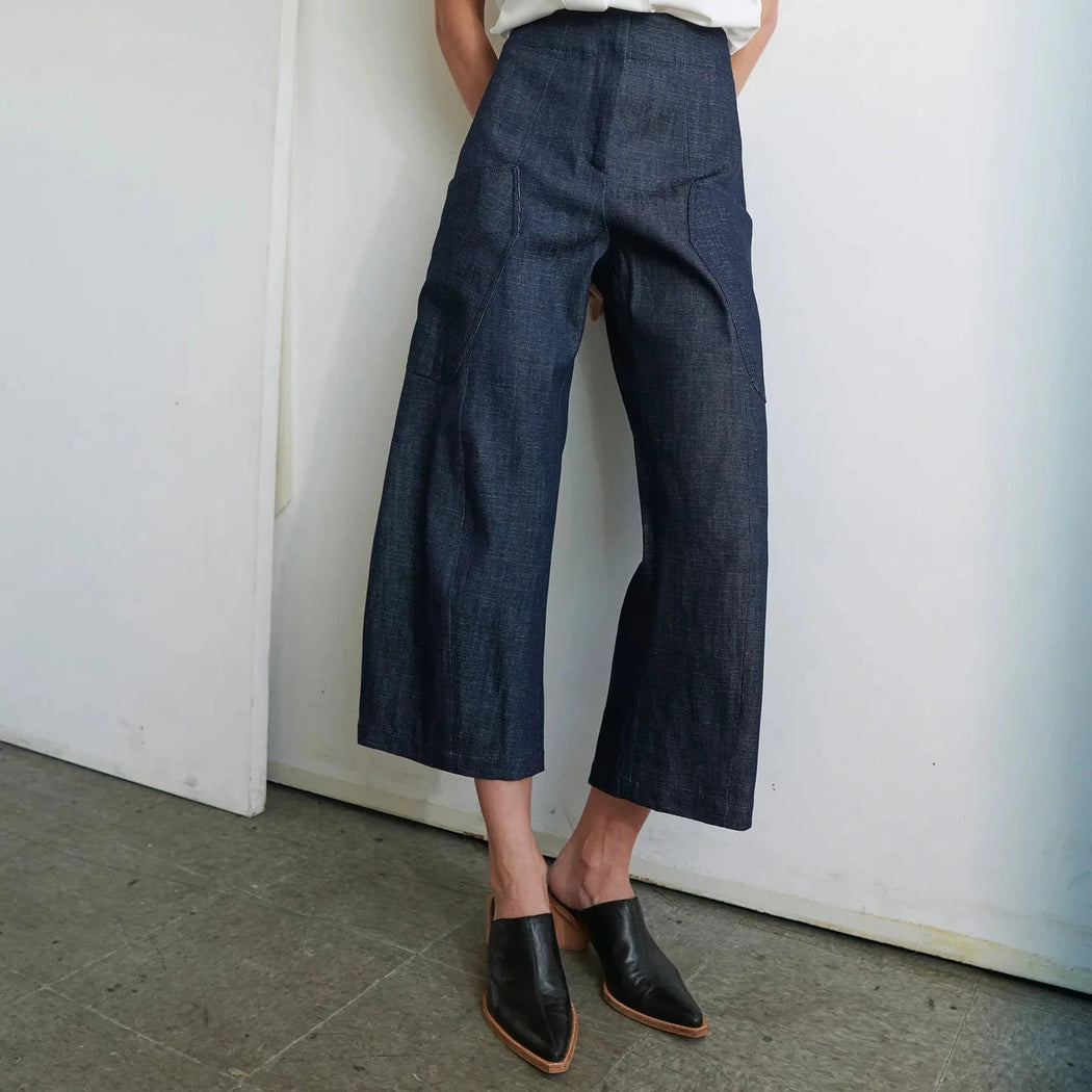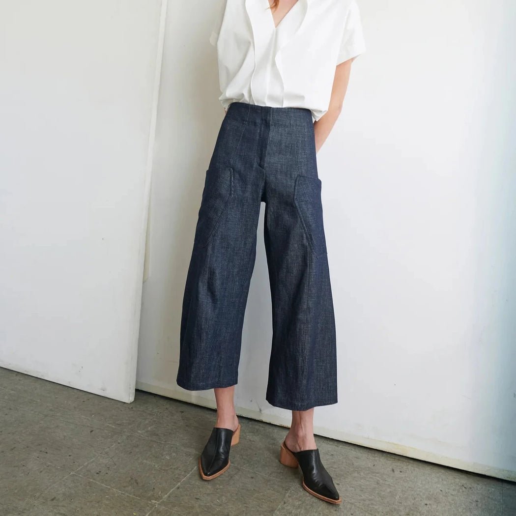 Organic denim cropped pant features front patch pockets, wide leg with curved silhouette. Front zip, hook closure.