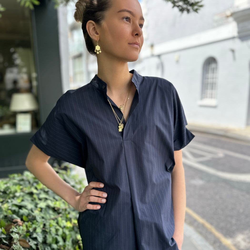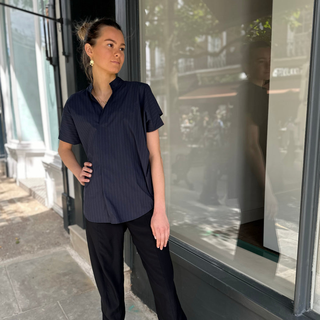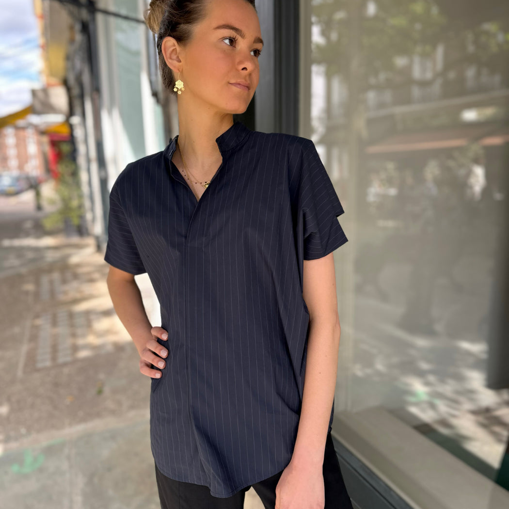 This organic cotton pinstripe short-sleeved pullover shirt has a draped sleeve detail and single button at banded collar. This innovative fabric is not only lightweight and easy to pack, but also environmentally friendly made from organic cotton and recycled textile waste. A minimal pinstripe adds a subtle pattern to the crisp, airy tech fabric.