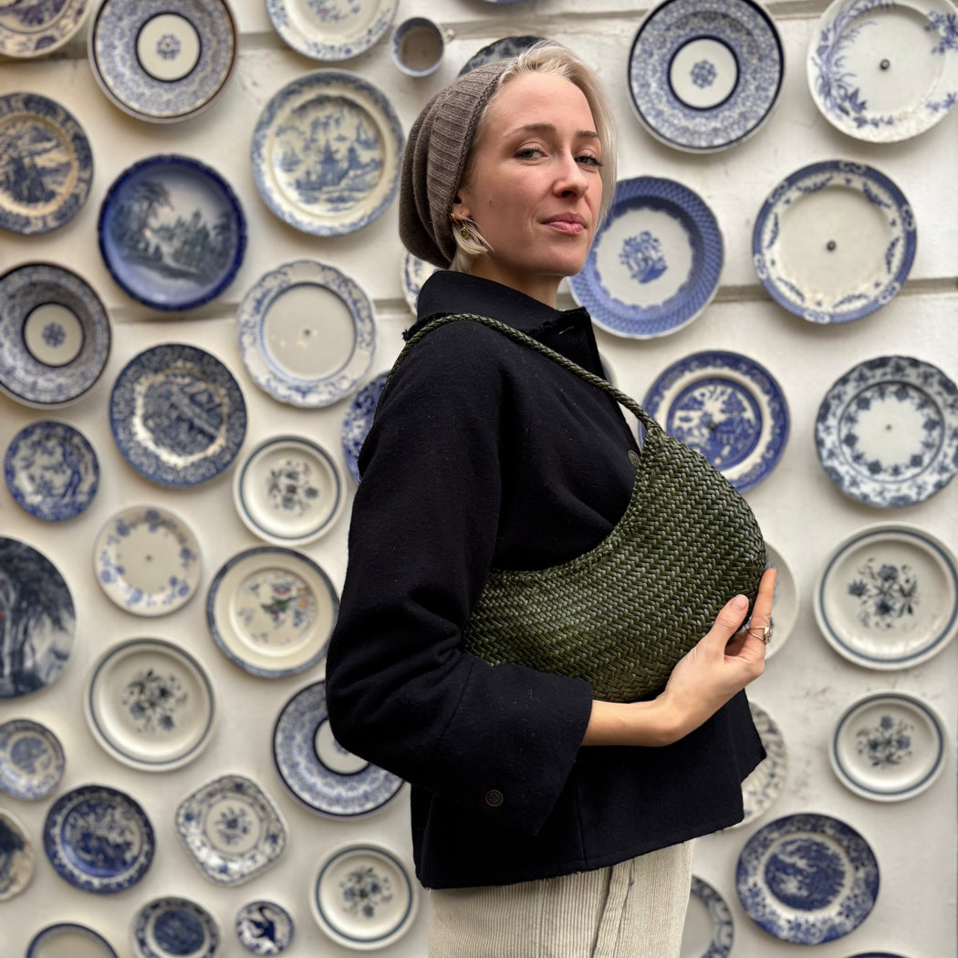 The "Nova Luna" is a compact version of the Luna Mezza, maintaining the unique round and supple design but in a smaller scale, crafted from soft Buffalo Calf leather. This tote features a woven handle that is designed to comfortably fit over your shoulder, making it easy to carry all day. The distinctive shape and size of the Nova Luna make it an ideal choice for those who need a smaller, yet still stylish bag for essential items.
