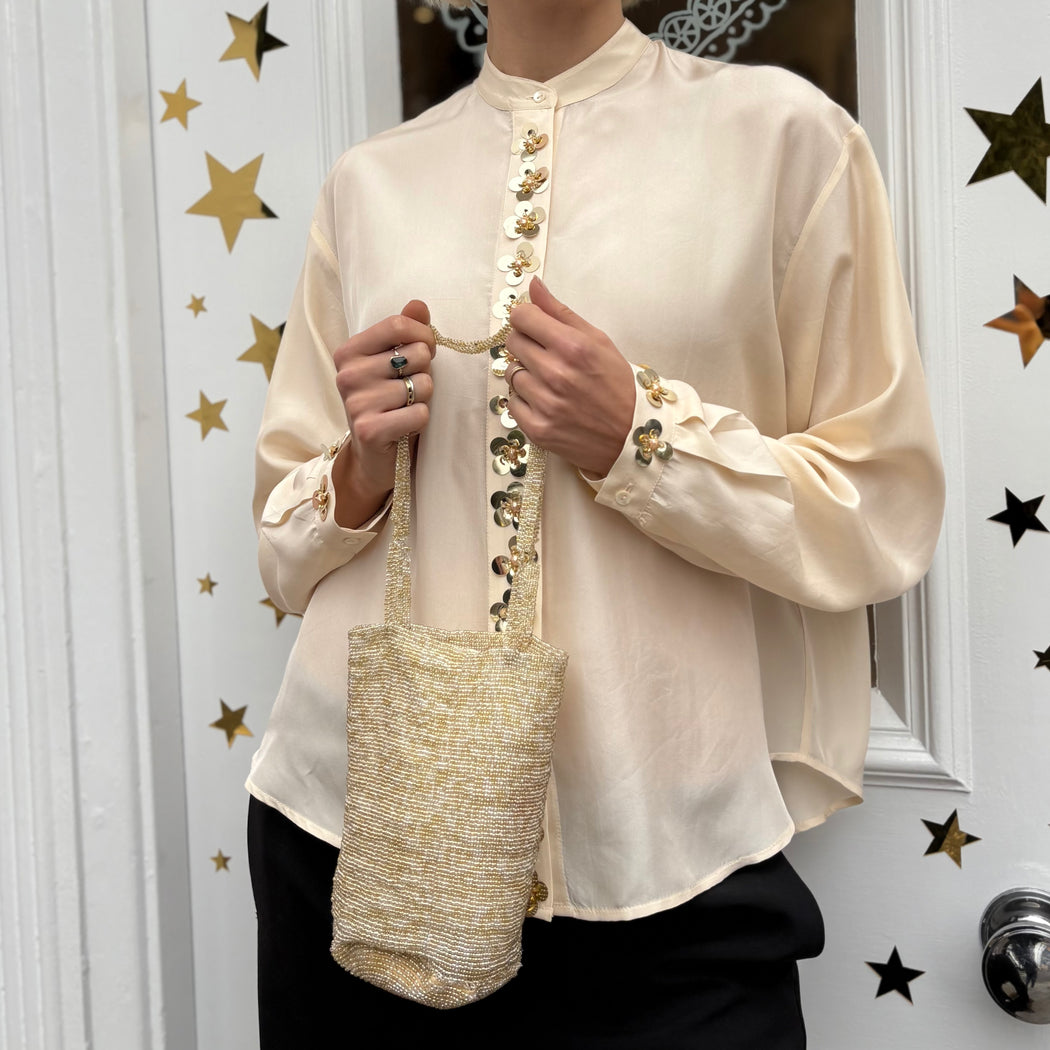Sparkly mini bag encrusted with glass beads that glisten like a jewel.