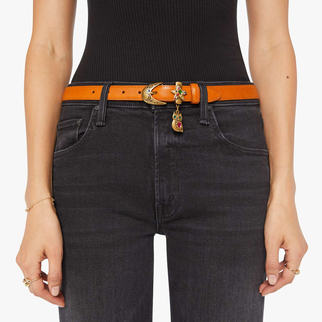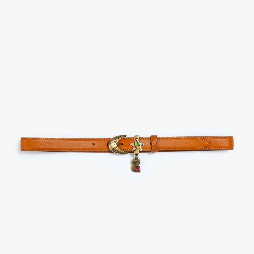Buckle up. MOTHER's take on the leather belt is designed with a gem-detailed moon buckle and a brass star charm with an owl hanging beneath. It's made from 100% cow leather in brown.