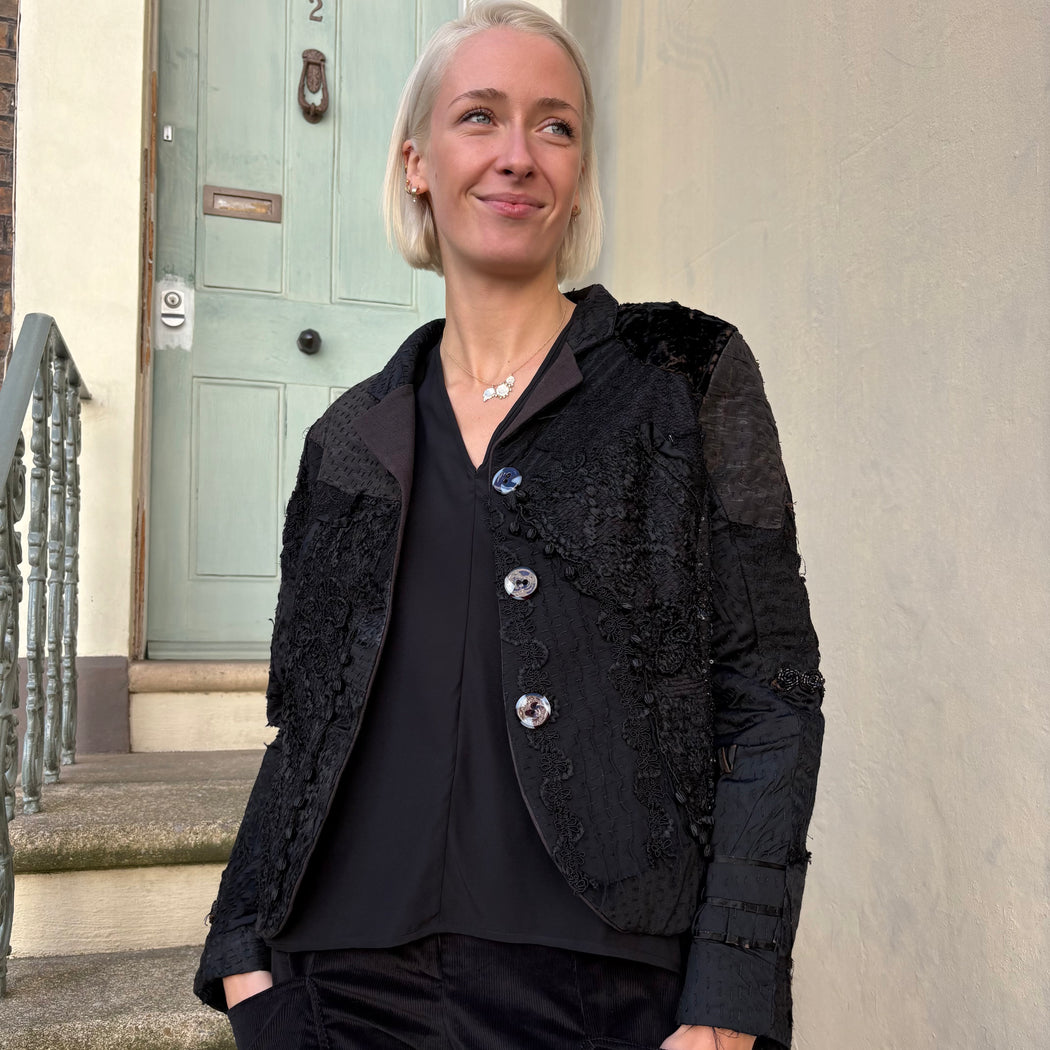 Hand-stitched vintage victorian silk with beautiful embellishment. A neat jacket with a curved hem and button closure does the front.