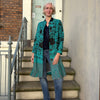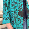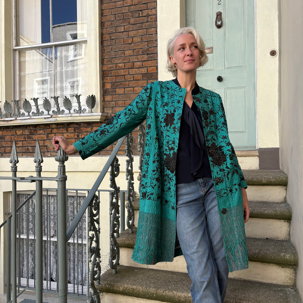 A vintage piano shawl has been reinvented into a fabulous evening coat. A show-stopping piece, perfect for occasion-wear but equally easy to wear with your go-to jeans and shirt for a more relaxed look. Note the black floral embroidery against the sea green silk.