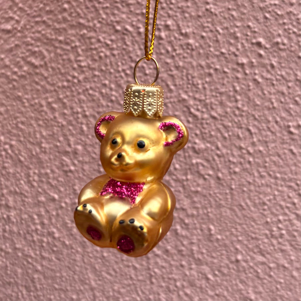 Gold Mini Teddy with Pink Bow Glass Christmas Ornament My cart