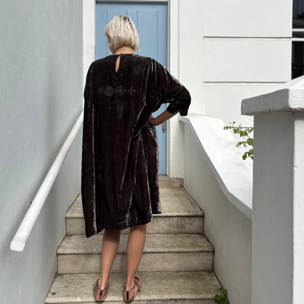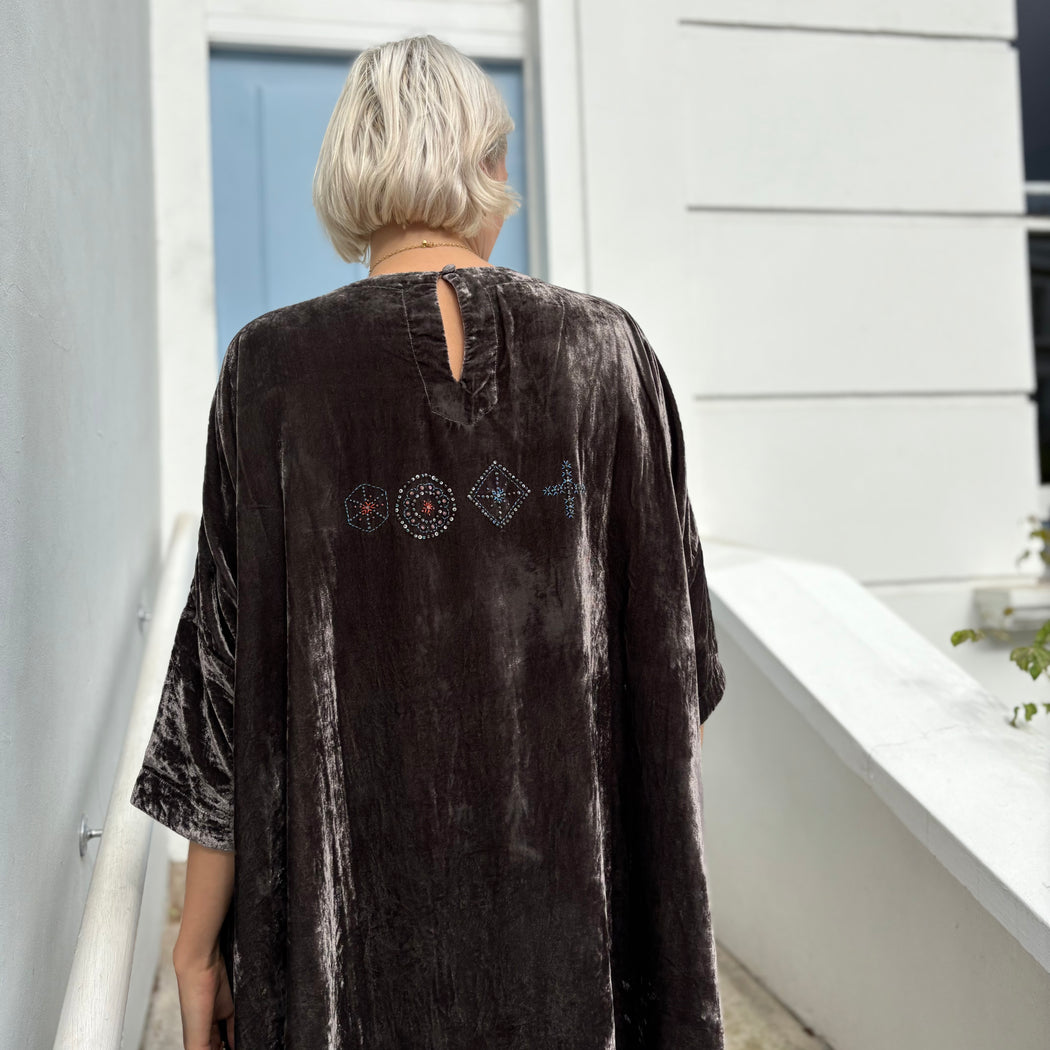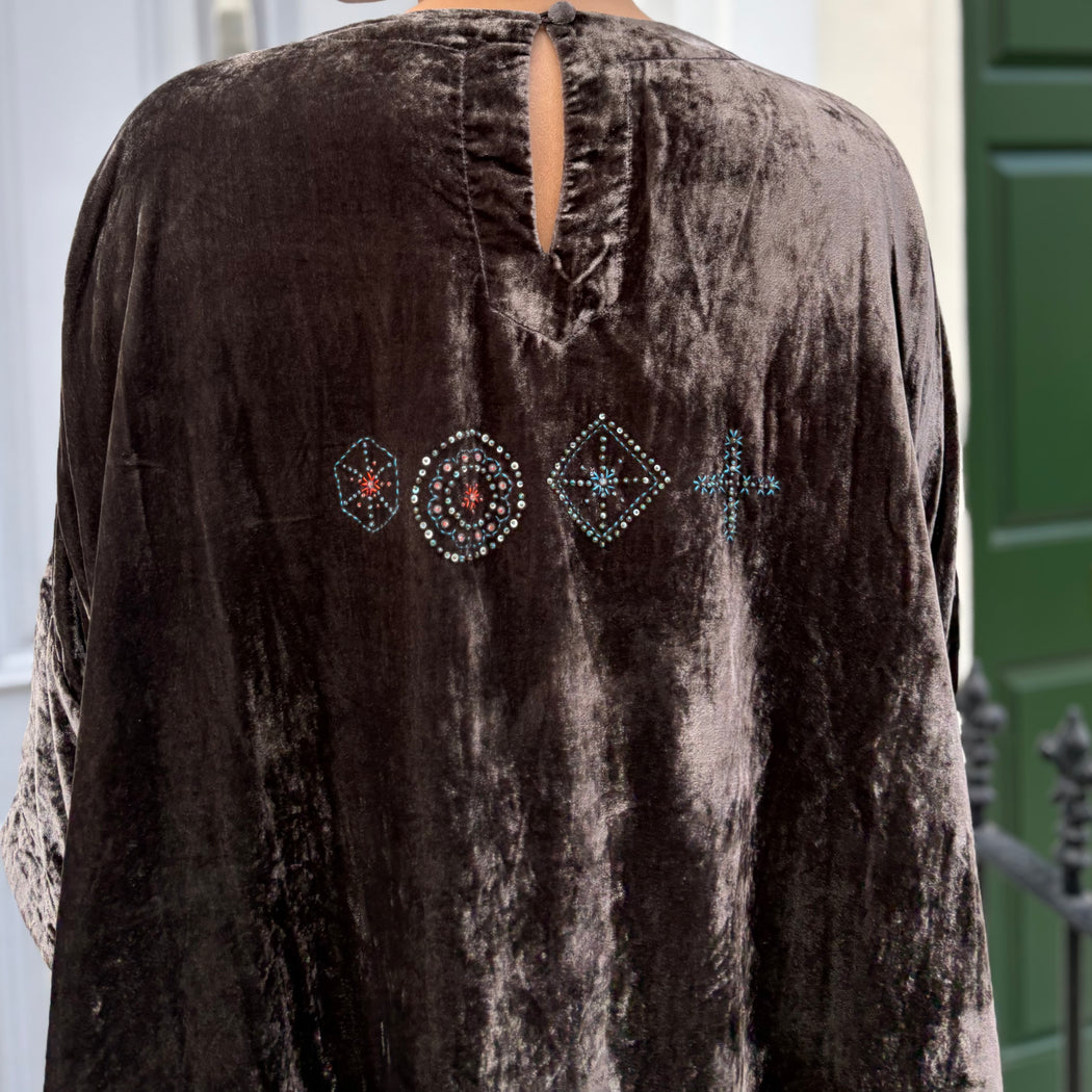 An oversized velvet dress, with 3/4 length sleeves and a round neck with a button closure at the back, finished with side pockets. Behold the beautiful beaded embroidery on the front and back of this piece.