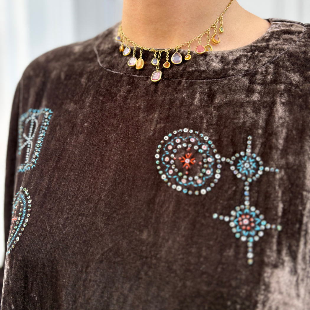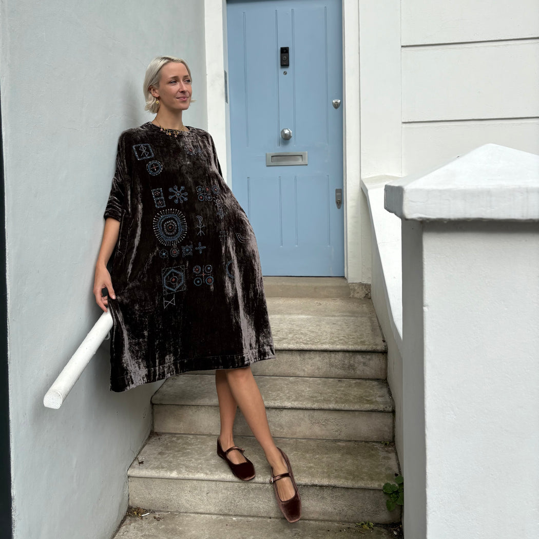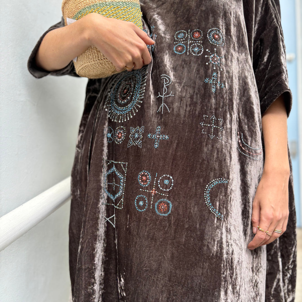 An oversized velvet dress, with 3/4 length sleeves and a round neck with a button closure at the back, finished with side pockets. Behold the beautiful beaded embroidery on the front and back of this piece.