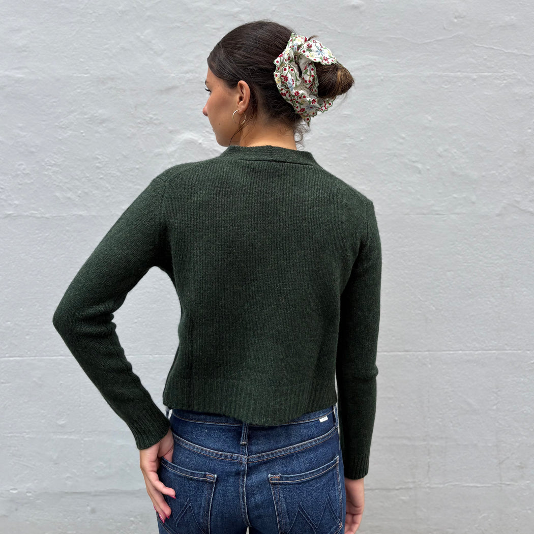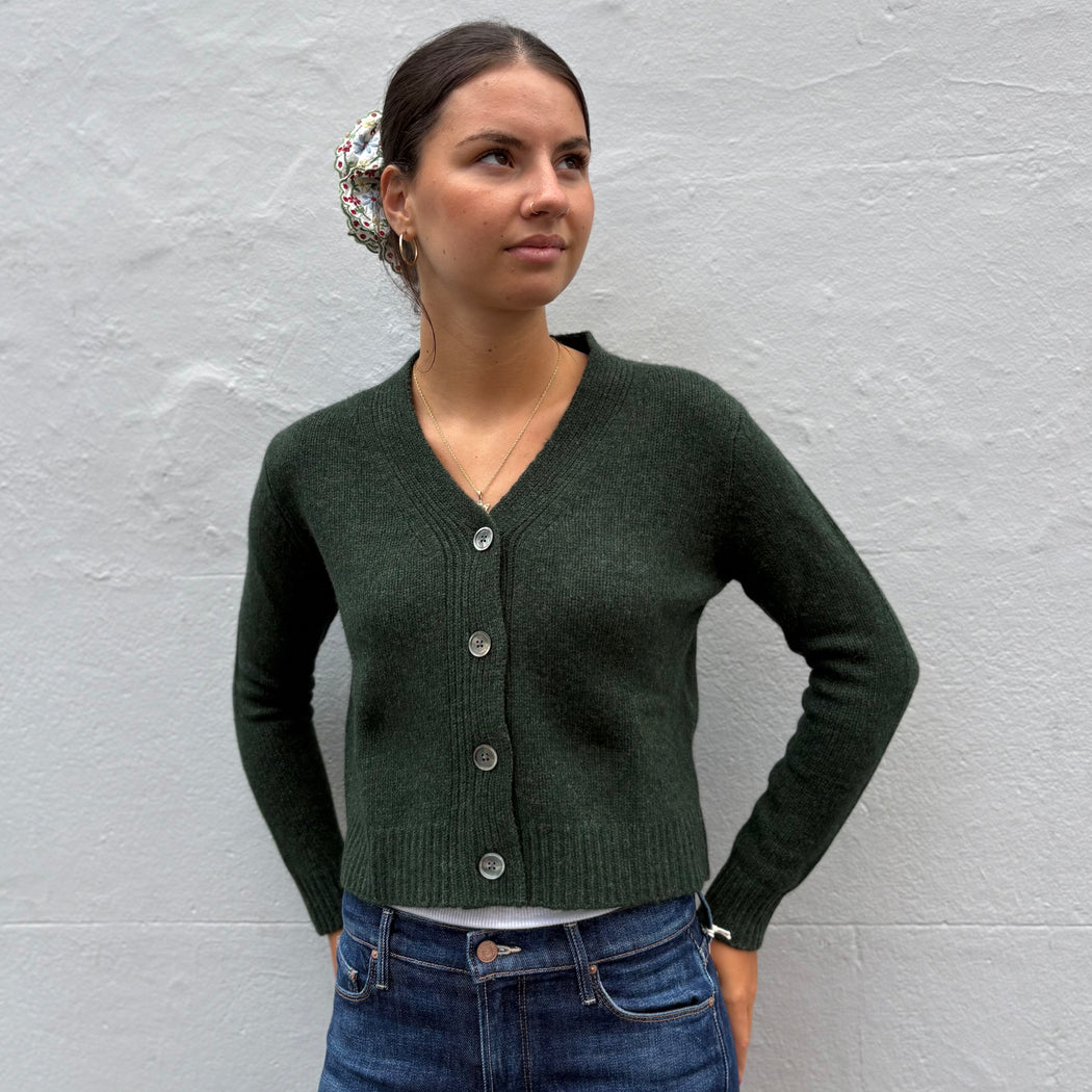 A boxy slightly cropped yak and merino cardigan. V neck and button closure. Fits true to size.