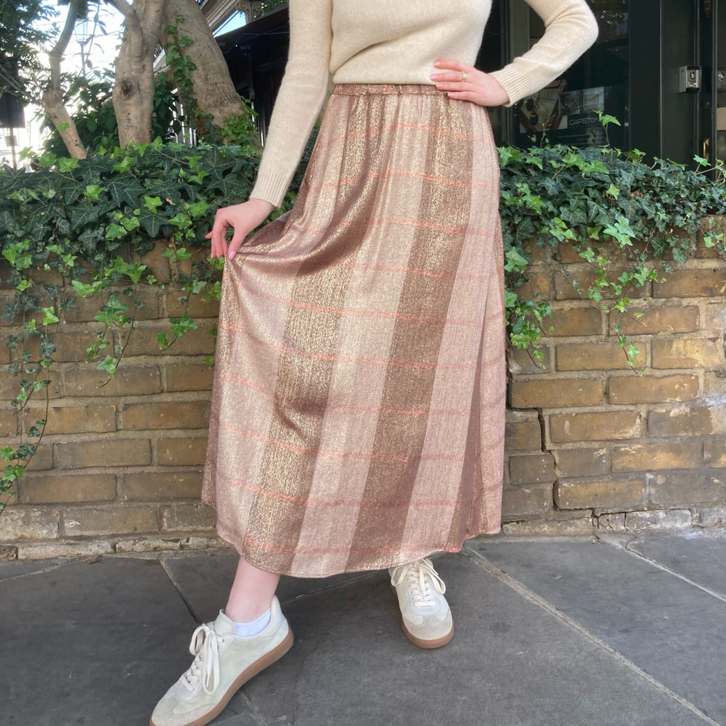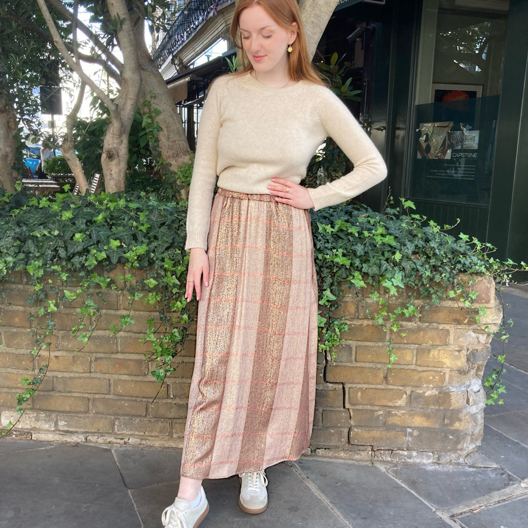 Threads of glistening gold lurex add a touch of glamour to this easy skirt shape. Maxi and free flowing. Style with a jumper and boots for a cosy ensemble.