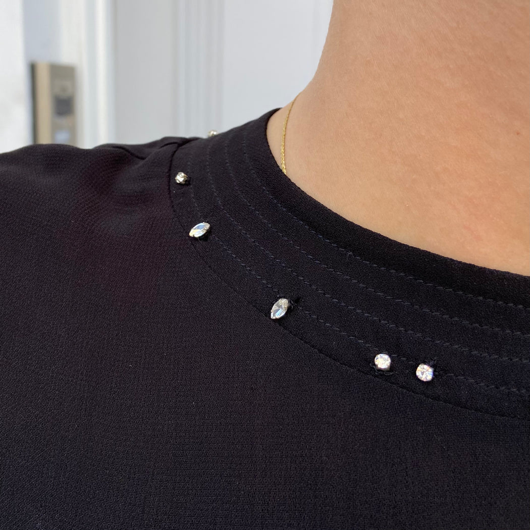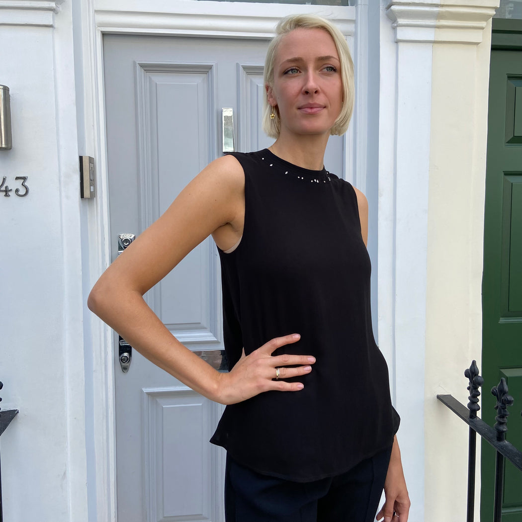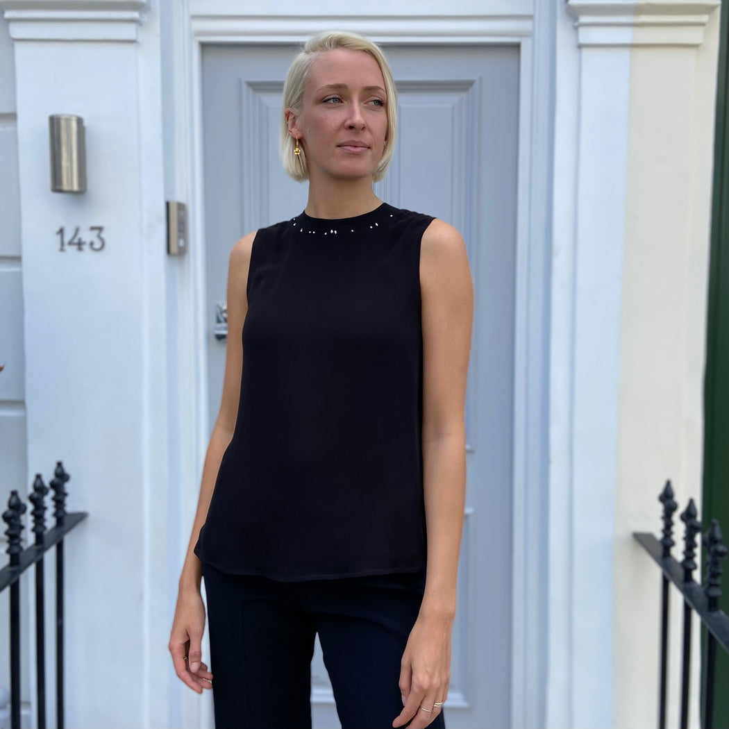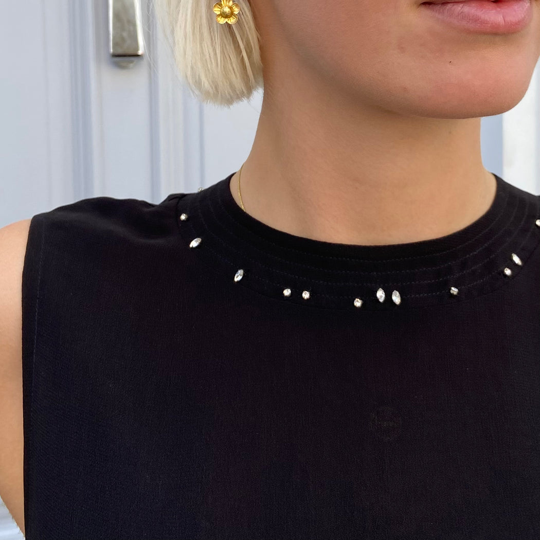 Round neck fluid viscose tank top. High round neck with embroidered rhinestone detailing. Loose fit with a curved hem.