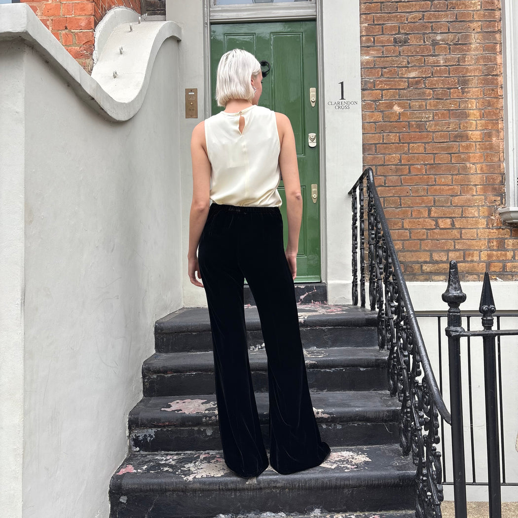 A soft plush velvet, these flared trousers flatter the figure with their sleek silhouette and feminine flair. Featuring an elastic at the back of the waist and side–zip fastening are a guarantee for comfort.