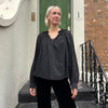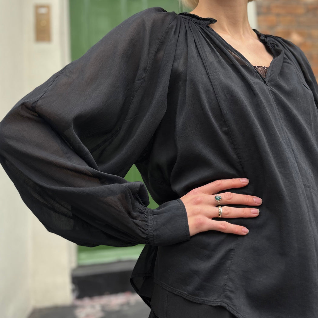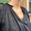 A boho shaped blouse, oversized with soft pleats. Velvet details, single button closure. Crafted from a cotton voile, slightly sheer. We recommend wearing a camisole underneath.