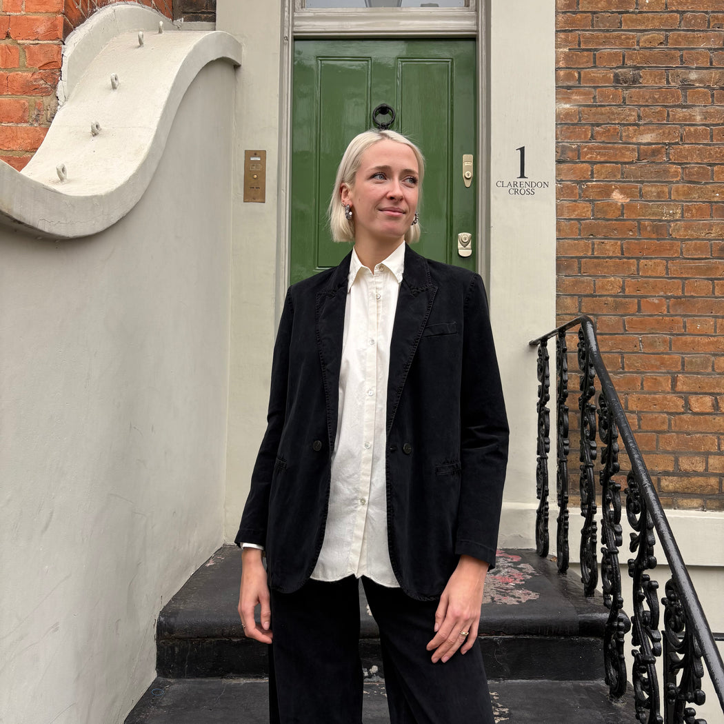 This blazer is crafted in a flocked cotton, with a velvety touch. A neat cut with a sleek look due to its fabric. To be worn casual or as a set with the matching trousers.