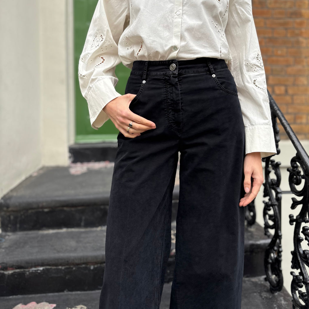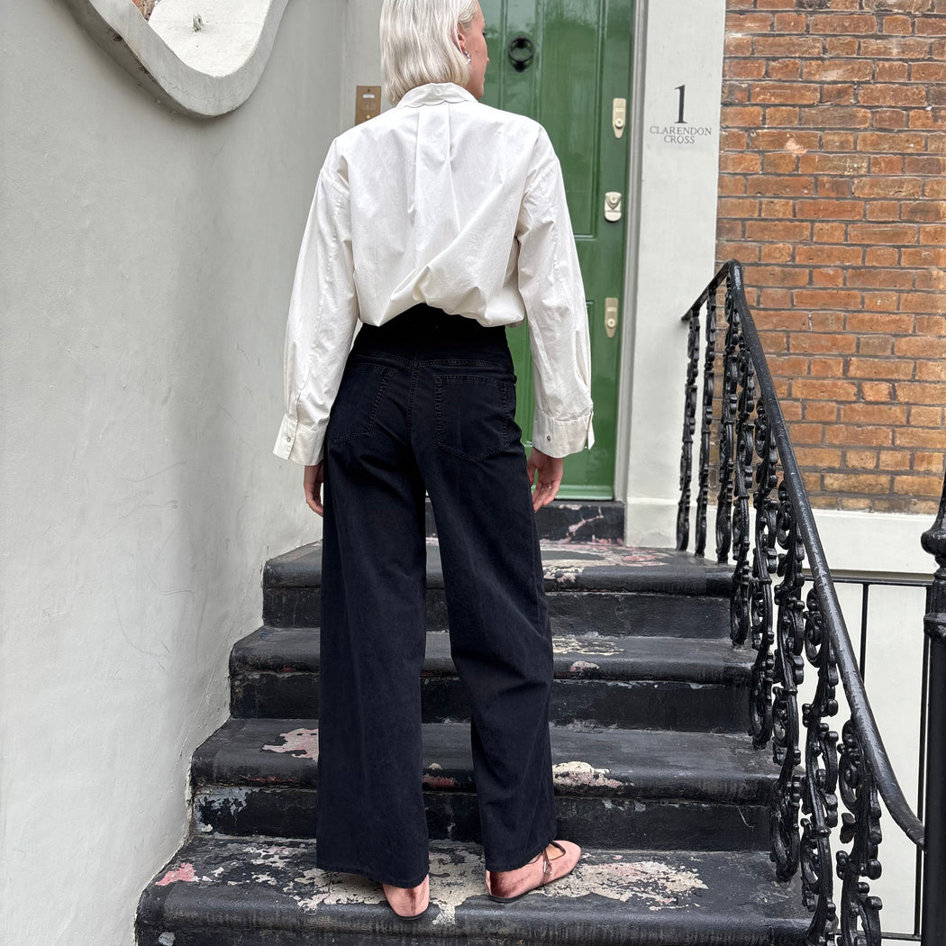 These trousers are crafted in a flocked cotton, with a velvety touch. High rise cut, super wide leg on a faded black fabric. A sleek trouser that could elevate any look. These trousers come up small.