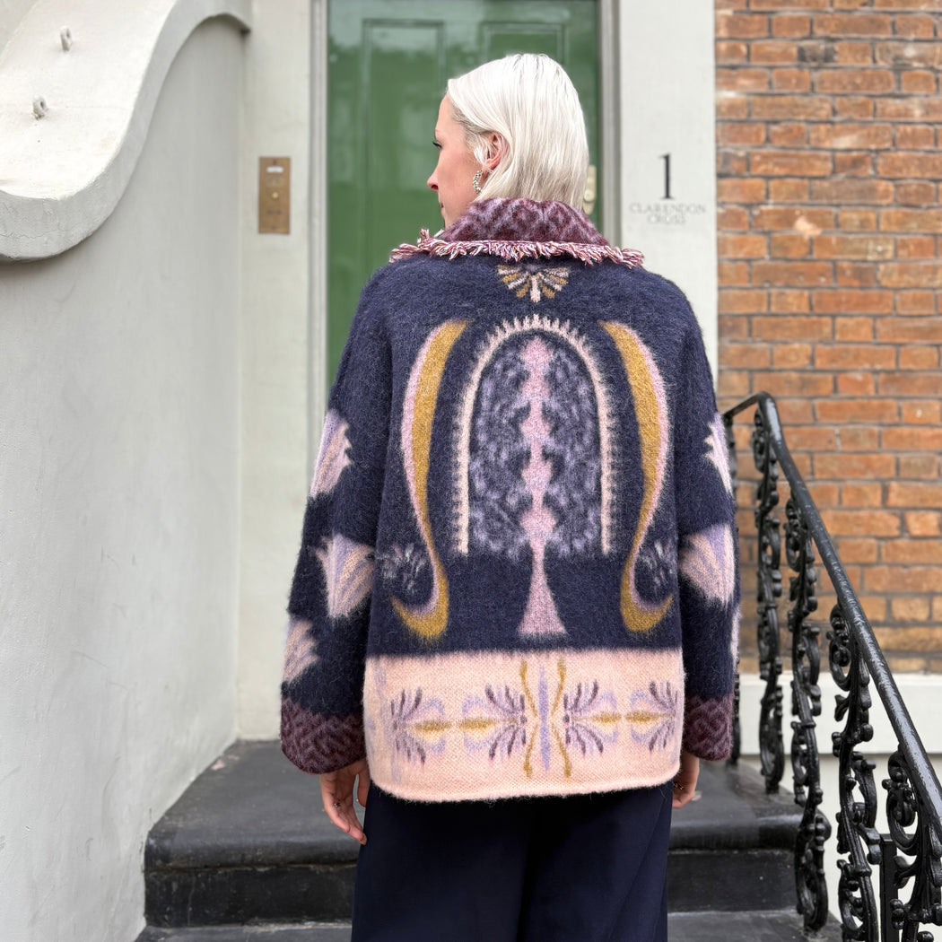 Artisanal handywork has given an opulent slant with this cardigan crafted in alpaca and gauzy wool. The jacquard patterning reflects the enchanted–forest motif of the collection. Featuring a dropped shoulder and concealed press studs, this piece fits true to size