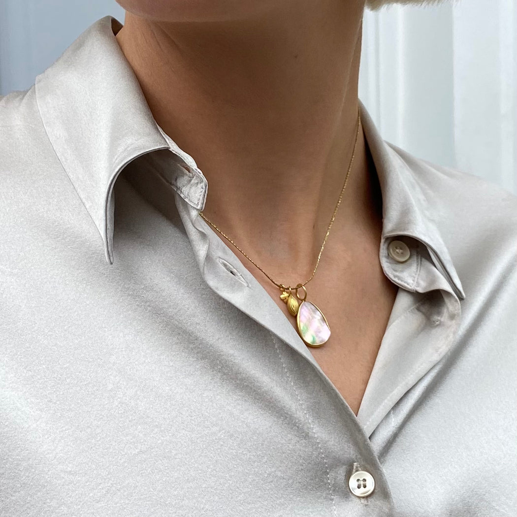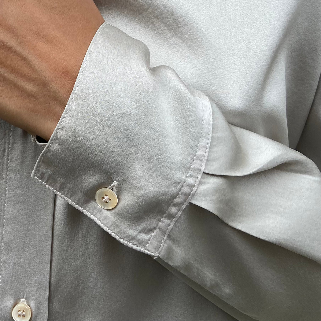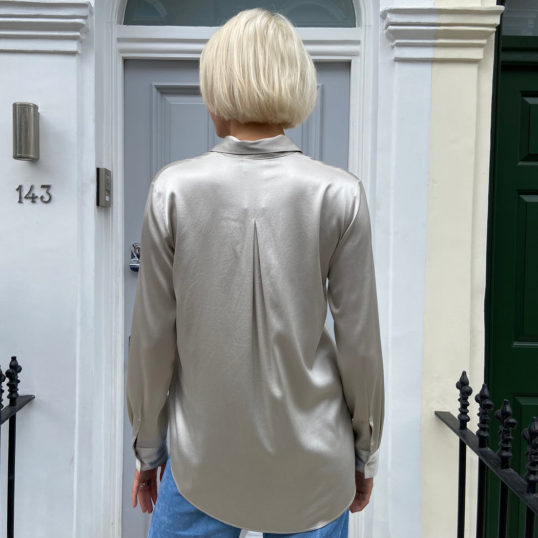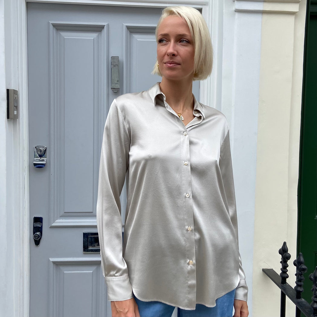A lustrous silk satin shirt with a ethereal silver colour will lift the autumnal colours of this season. A classic shirt shape with regular shoulders and a loose fit overall.