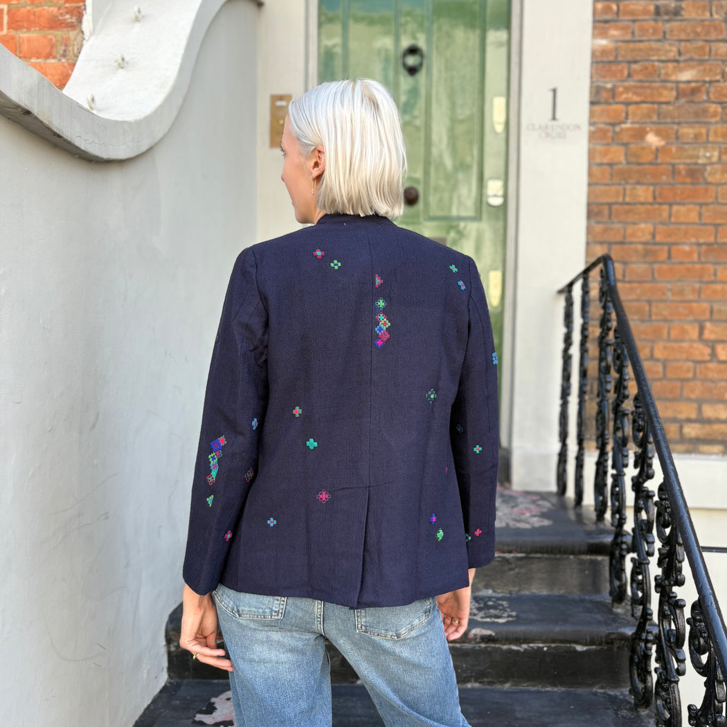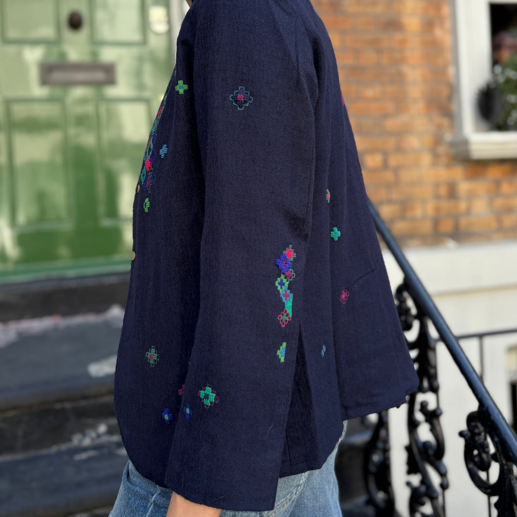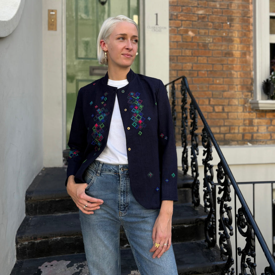 This jacket is an unstructured take on a classic Nehru style. This style is cut in lightweight, beautifully soft wool and silk . Featuring a stand Nehru collar, three button down front and silk lining. This jacket is scattered with multicoloured embroidery, another feature that makes this piece unique and so intricate in design.