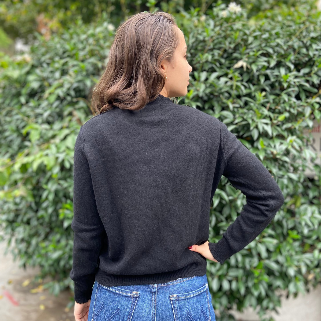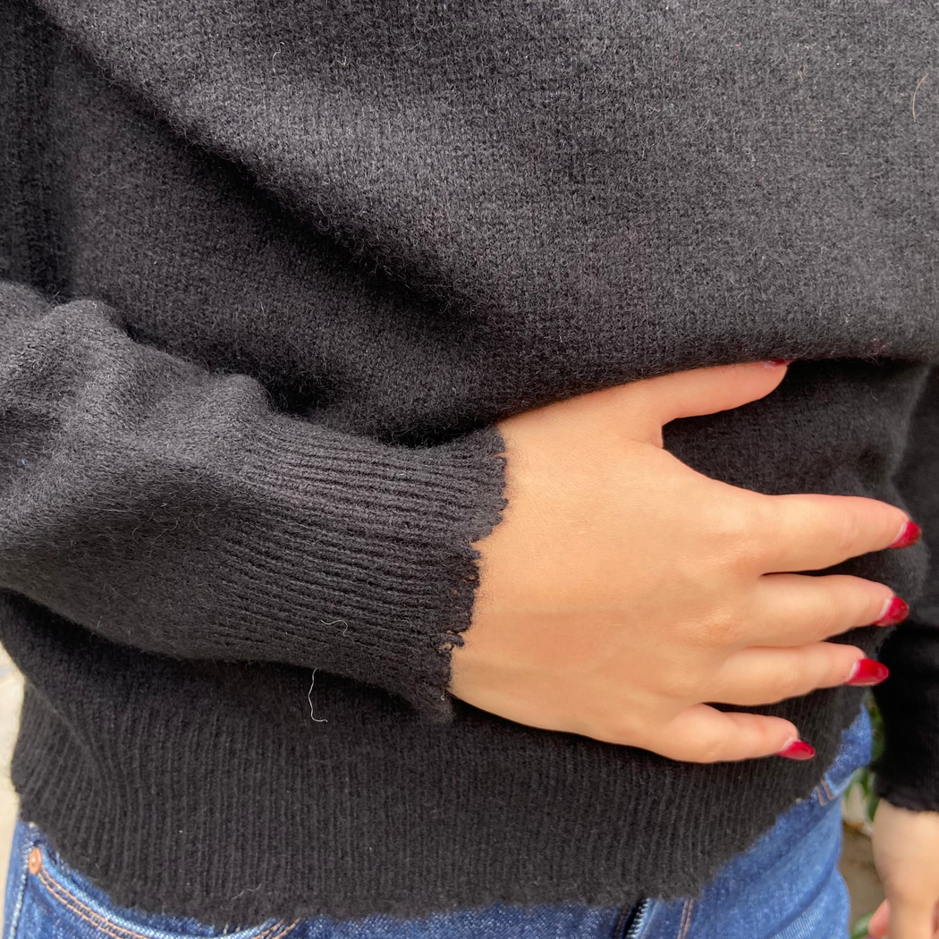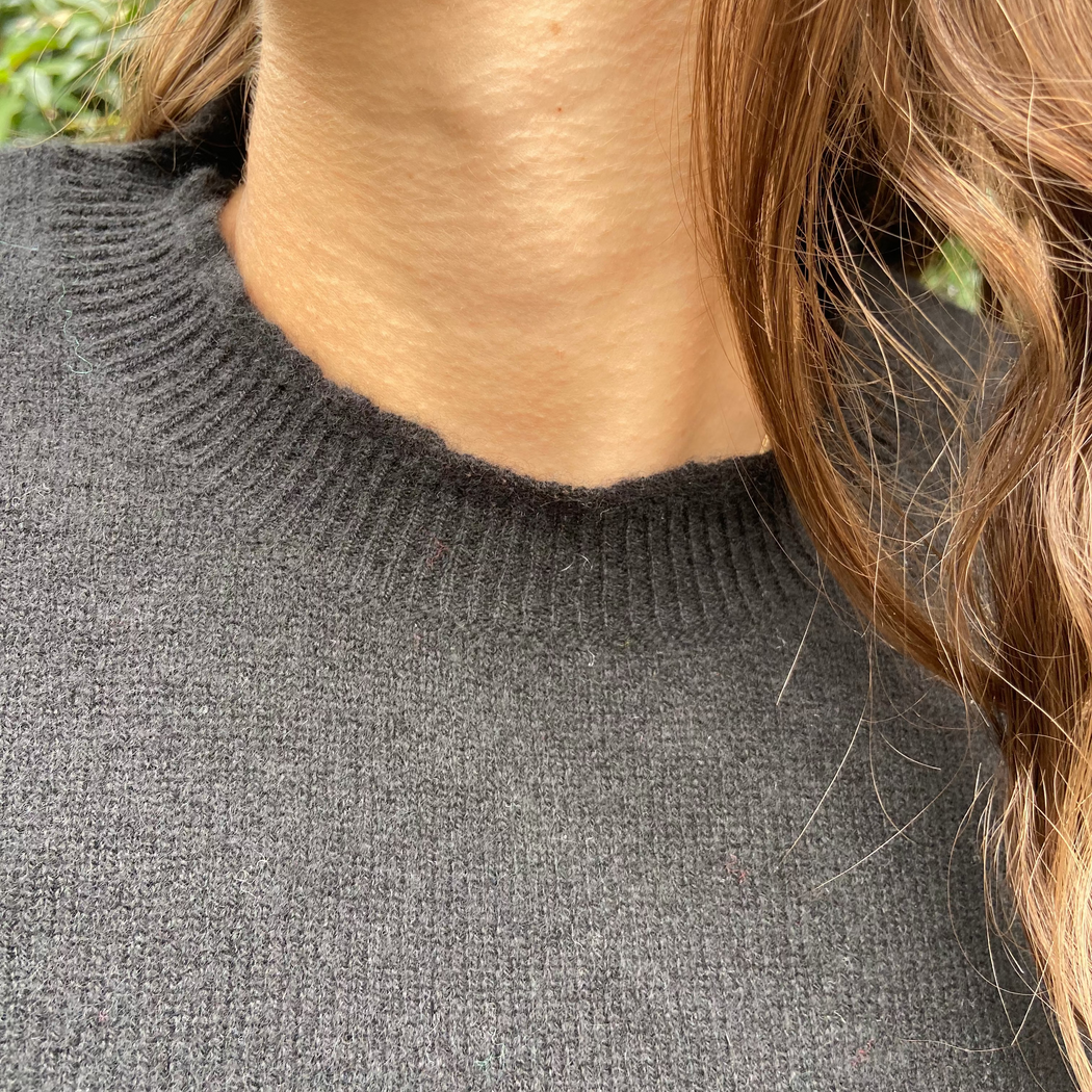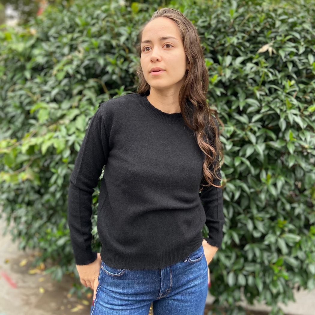 Black cashmere crew neck with 'distressed' ribs. A generous fit and even if we say so ourselves a great update to a classic fit crew neck!