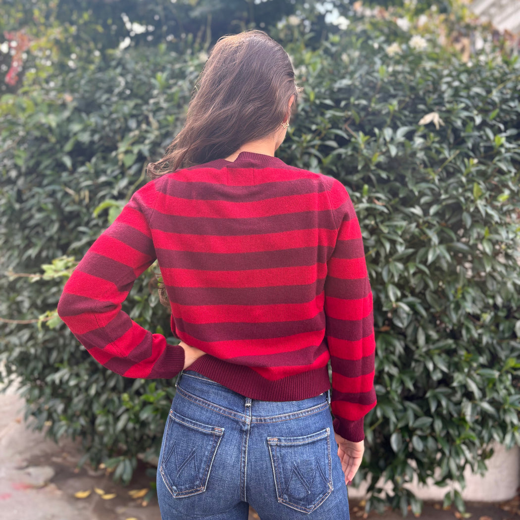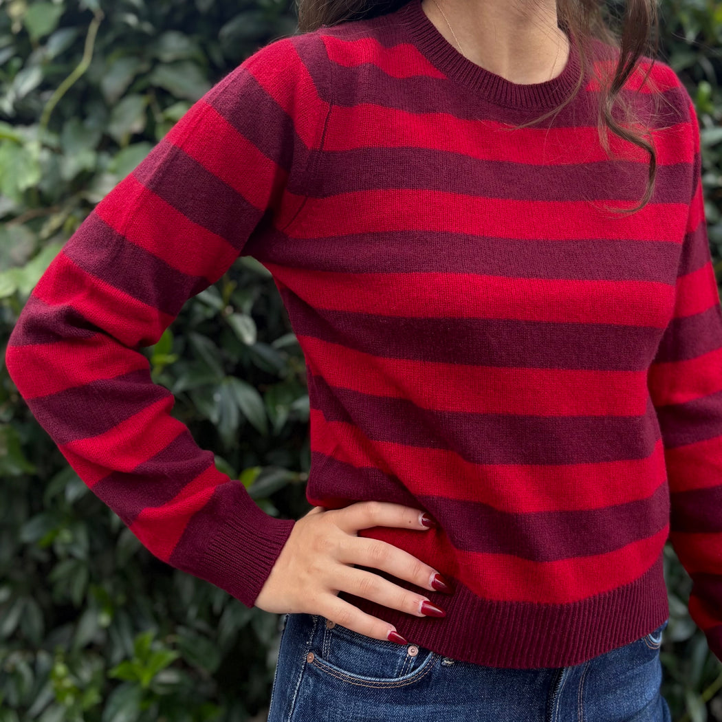 Best selling lightweight cashmere stripe crew neck in burgundy and red. True to size.