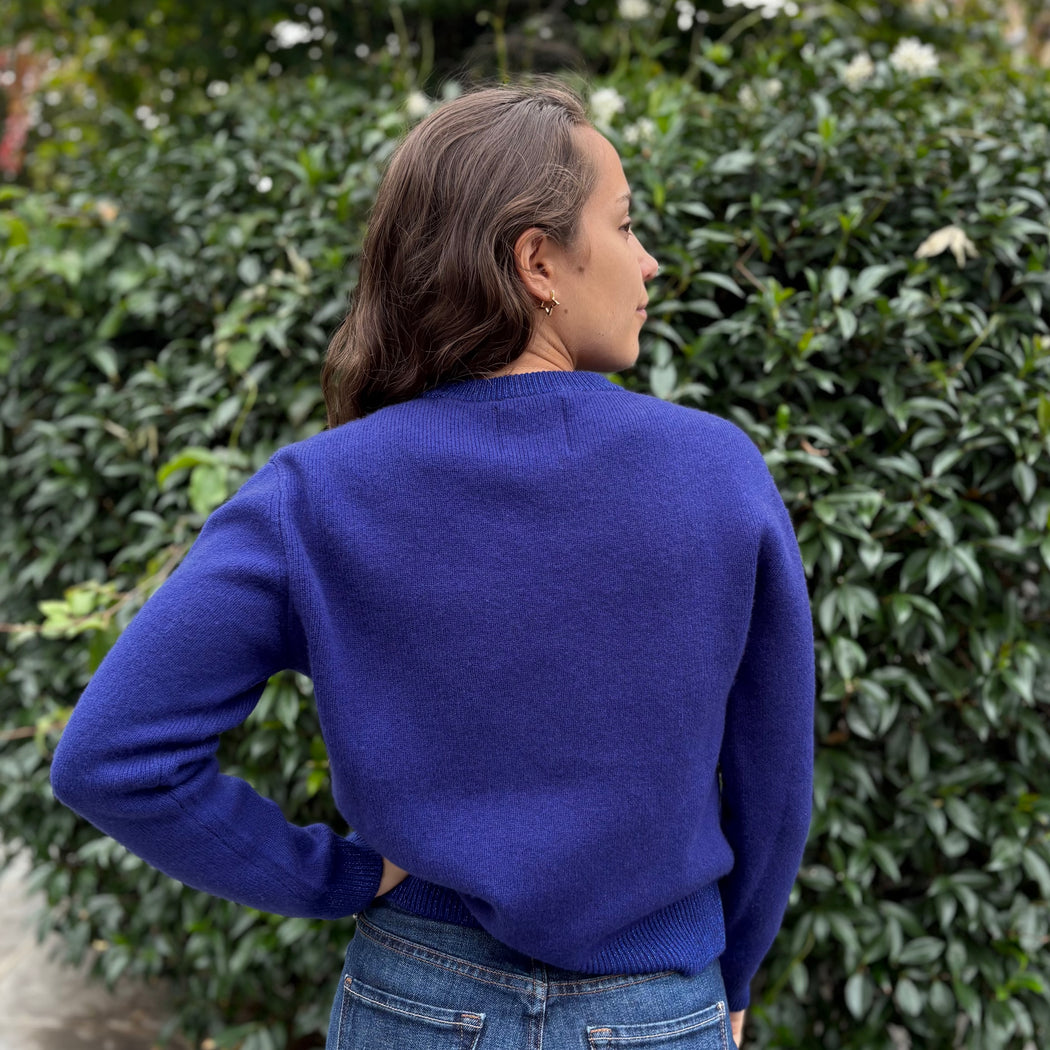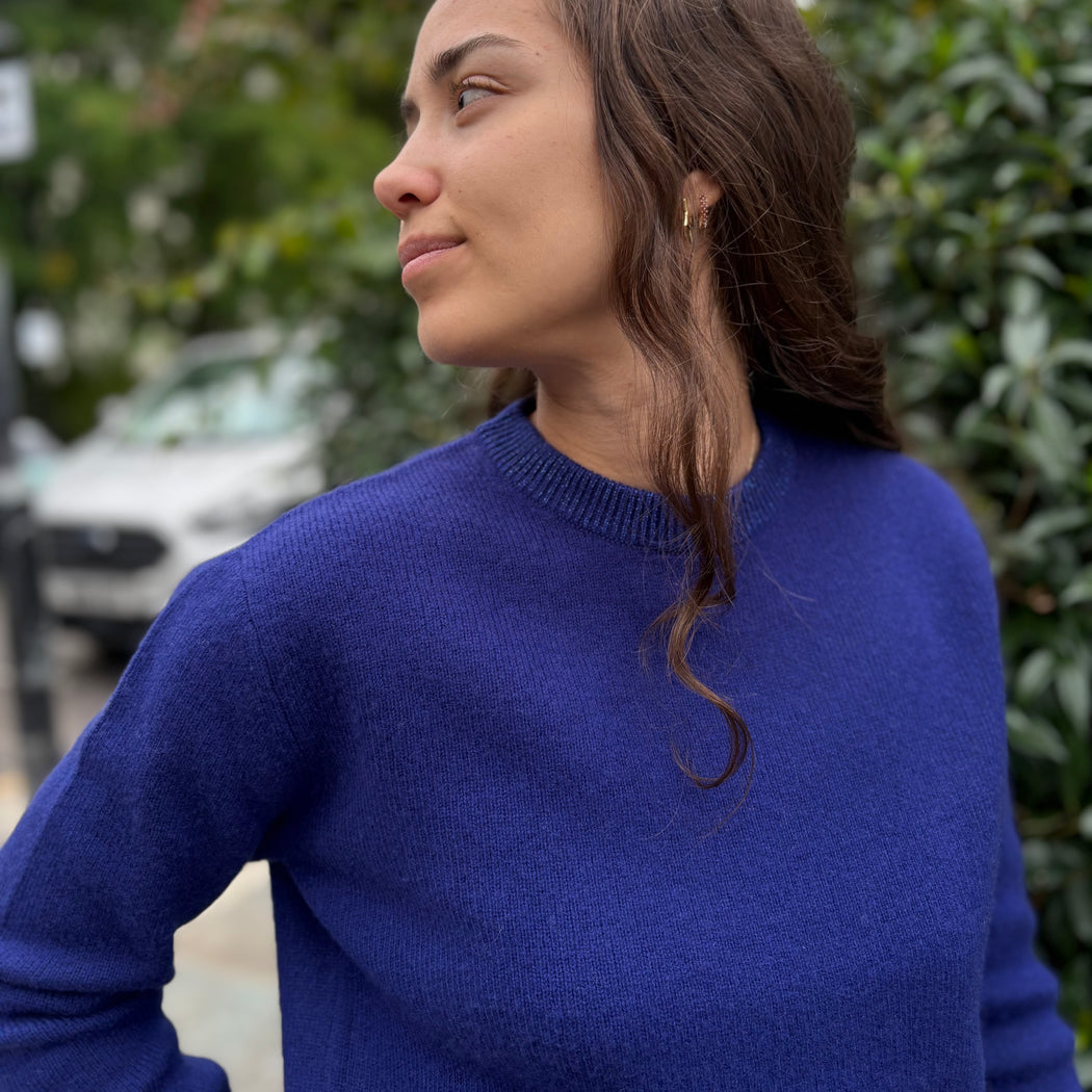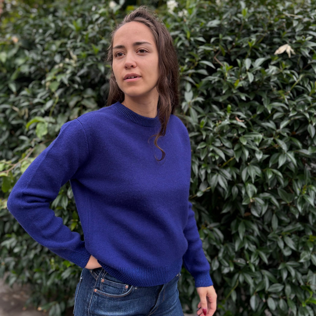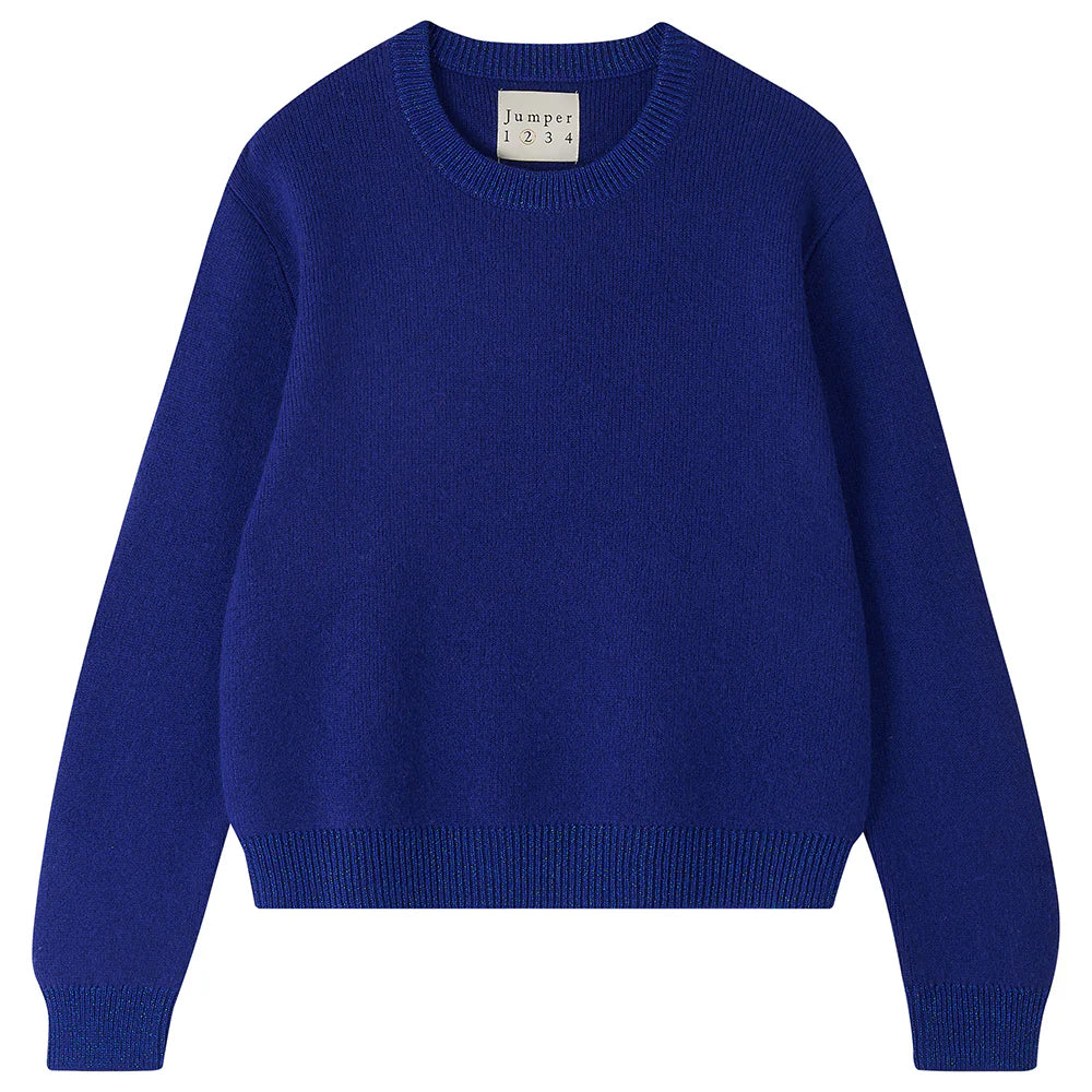 Cashmere and wool heavier weight crew neck jumper in blue lurex running through the ribs. True to size and there are matching socks available too!